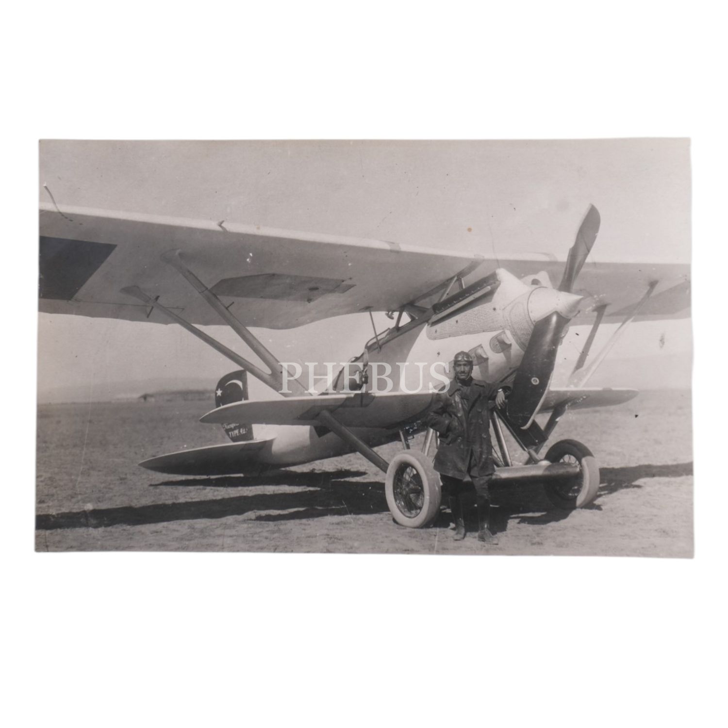Ay-yıldız kuyruklu bir Türk uçağının önünde poz veren bir Türk tayyarecisi, 14x9 cm...