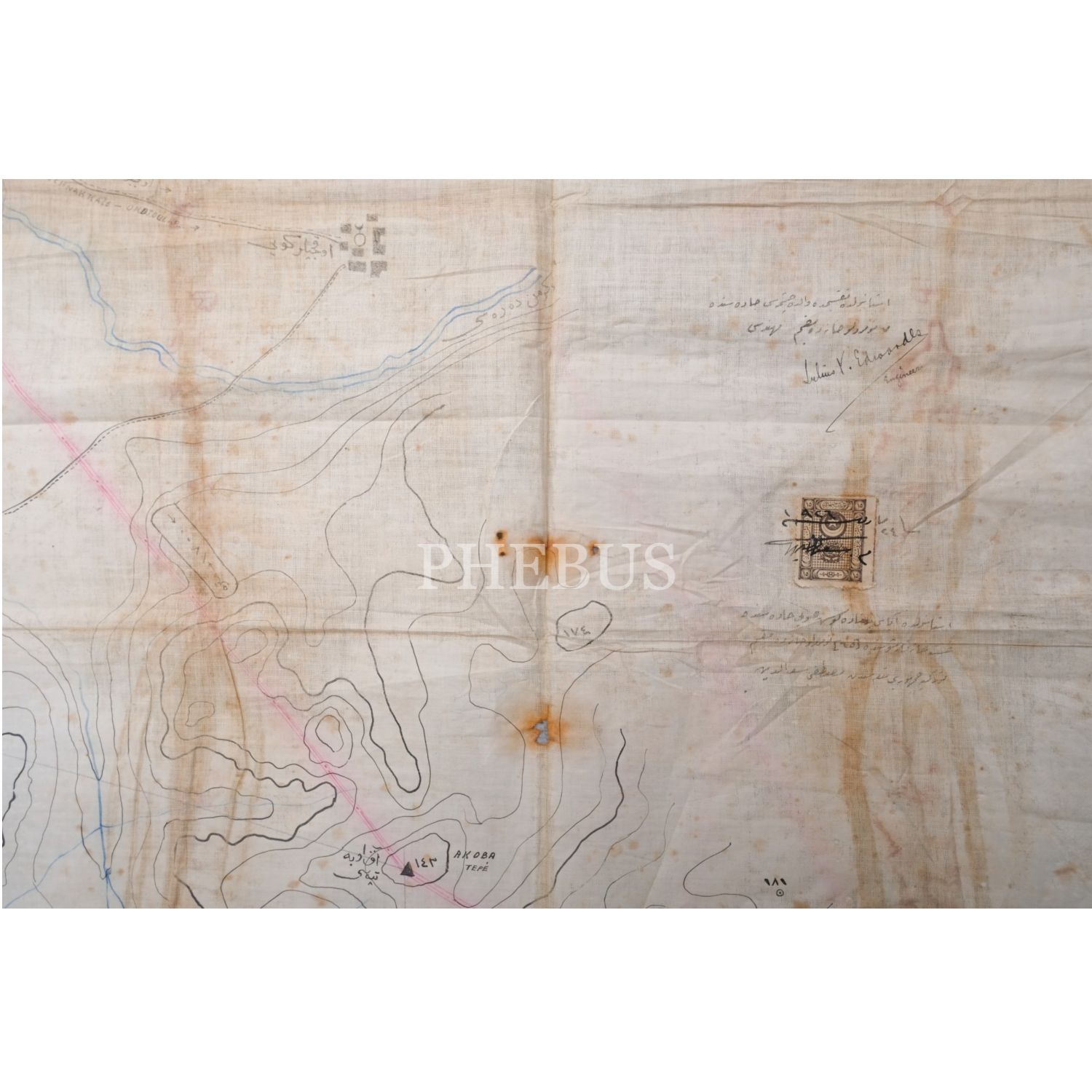 "Çanakkale Vilayeti Merkezine Tabi´ Kızılcaviran (Kızılcaören) Karyesi´nde Kain Krom Madeninin Haritasıdır" başlıklı, Çanakkale Kızılcaören´deki krom madeninin, harita mühendisi Mustafa Sadettin imzalı, Osmanlıca el çizimi haritası, 95x95 cm...