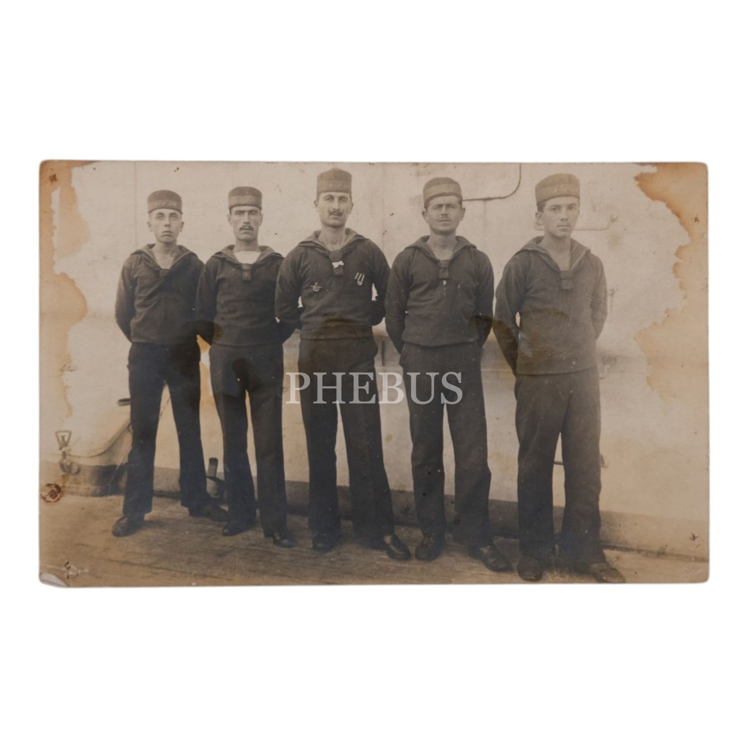 Şapkalarının bandında Osmanlıca "Yavuz Z. H." (Yavuz Zırhlı-yı Hümayunu) yazılı, Yavuz Zırhlısı mürettebatından bir tanesi Çanakkale Harp Madalyalı 5 Osmanlı bahriyelisinin hatıra fotoğrafı, 14x9 cm...