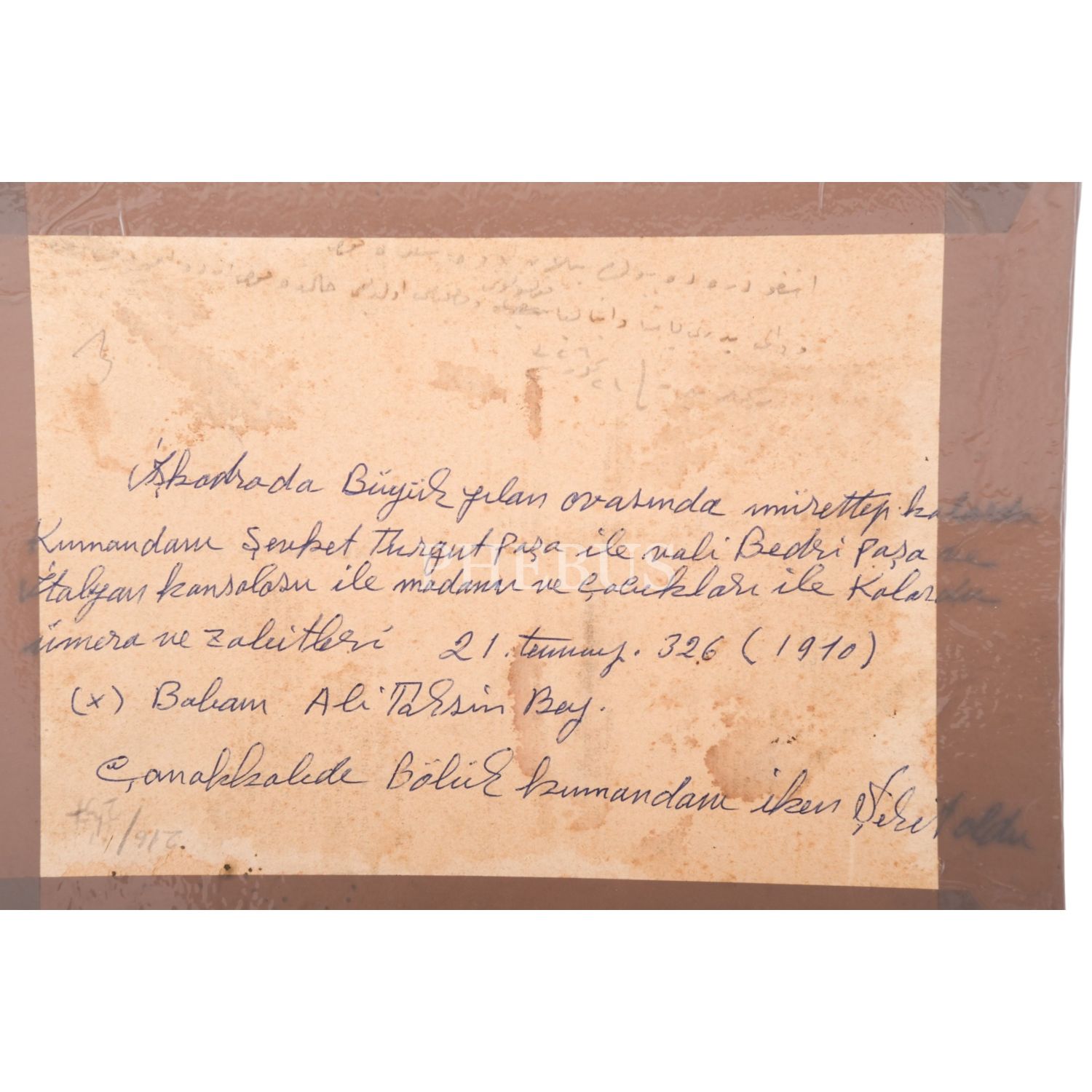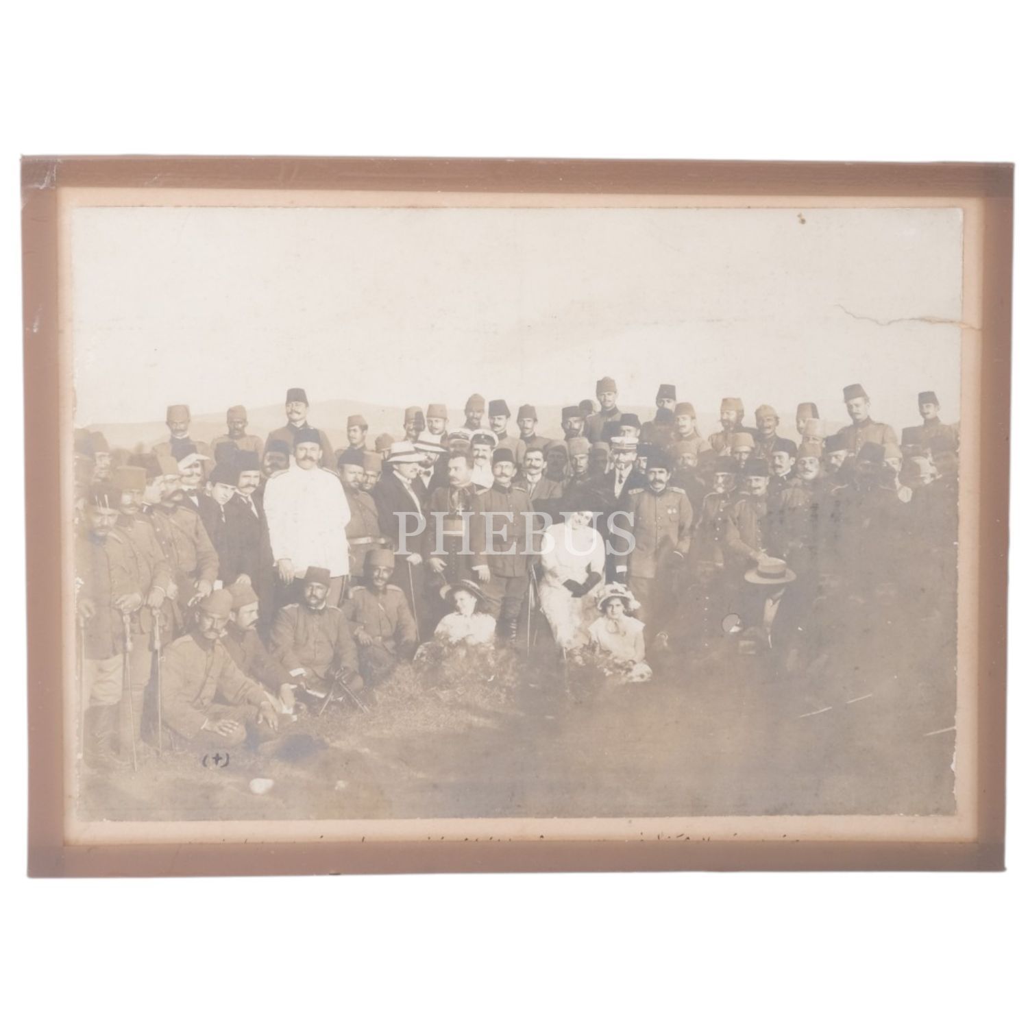 Balkan Harbi dönemindeİşkodra´da Yılanovası´nda 2. Kolordu Komutanı Şevket Turgut Paşa, Vali Bedri Paşa, İtalyan Konsolosu ile ailesi ve kolordunun subaylarının hatıra fotoğrafı, 1910, 26x20 cm...