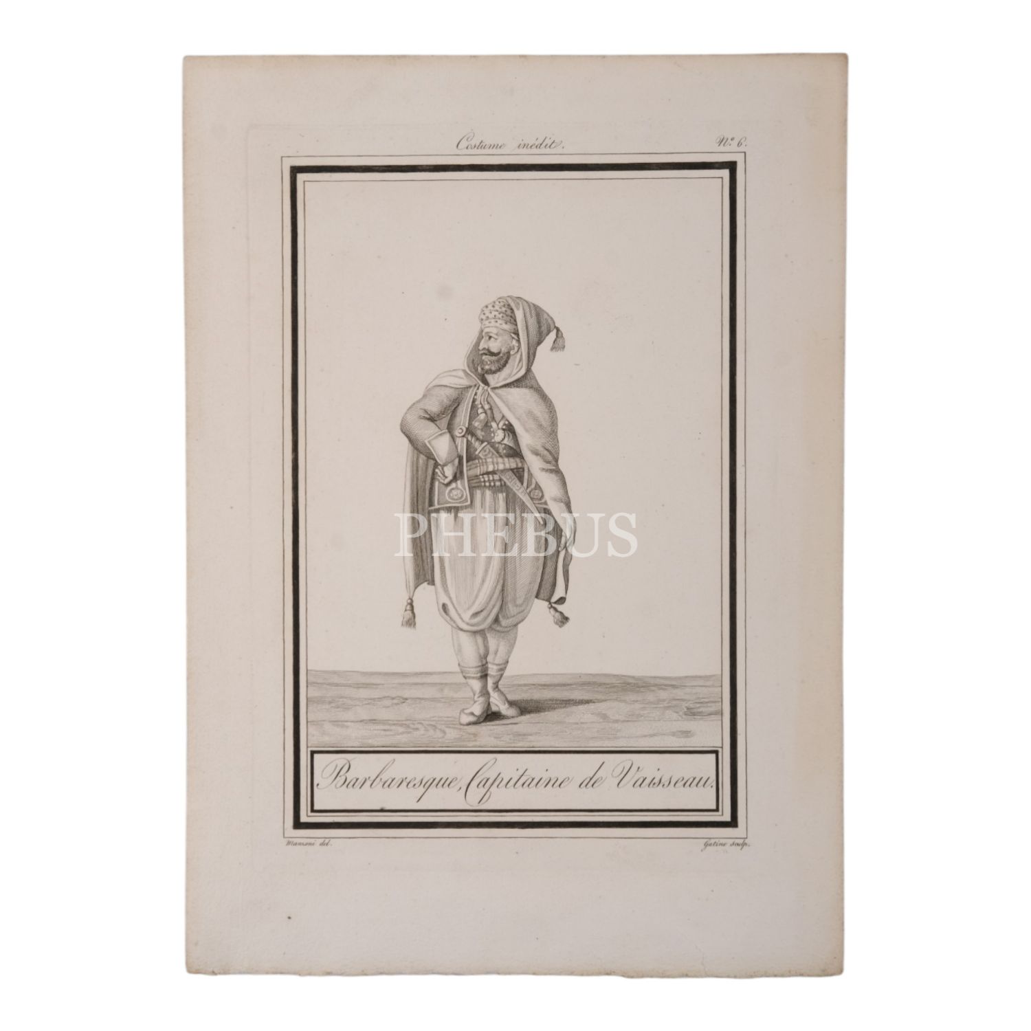 Georges-Jacques Gatine´in "Costumes orientaux inédits" adlı eserinde yer verdiği Berberi korsanı gravürü, "Barbaresque, capitaine de Vaisseau", 22x31 cm...