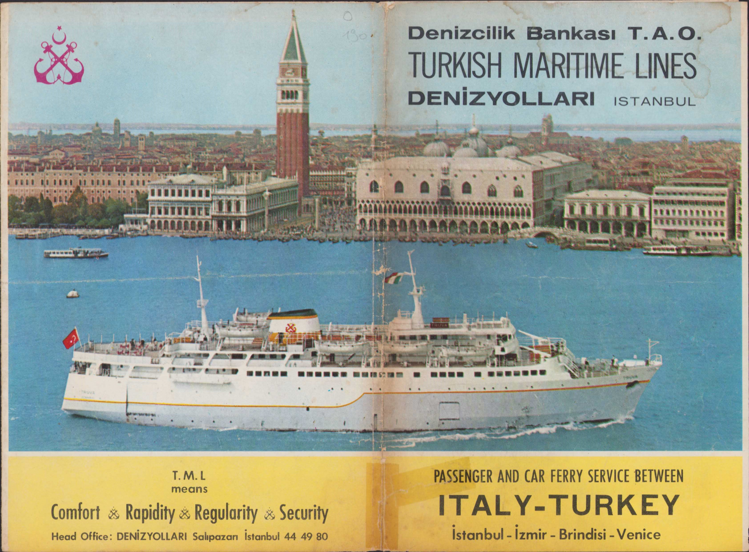 Denizcilik Bankası Denizyolları broşürü, İstanbul-İzmir-Brindisi-Venice seferi tanıtımı ve programı, katlamalı 6 sayfa, 1967 tarihli