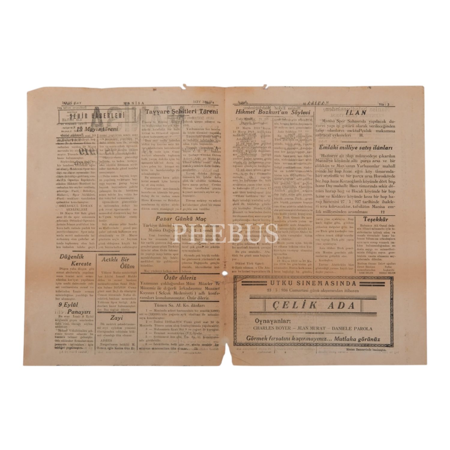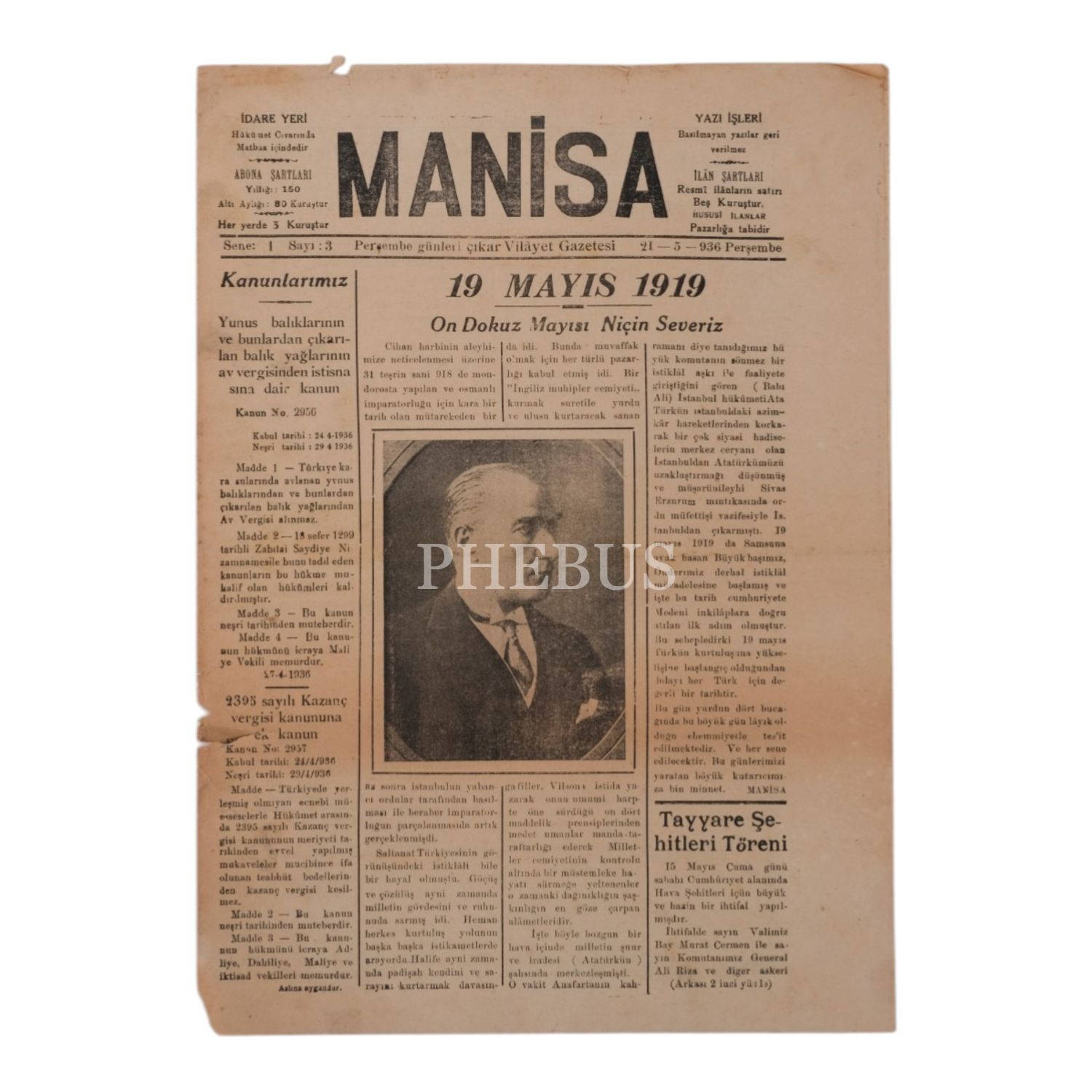 "Perşembe günleri çıkar Vilâyet Gazetesi" MANİSA´nın, 21 Mayıs 1936 tarihli, 19 Mayıs ve Tayyare Şehitleri Töreni konulu 3. sayısı, 4 sayfa, 28,5x40 cm...