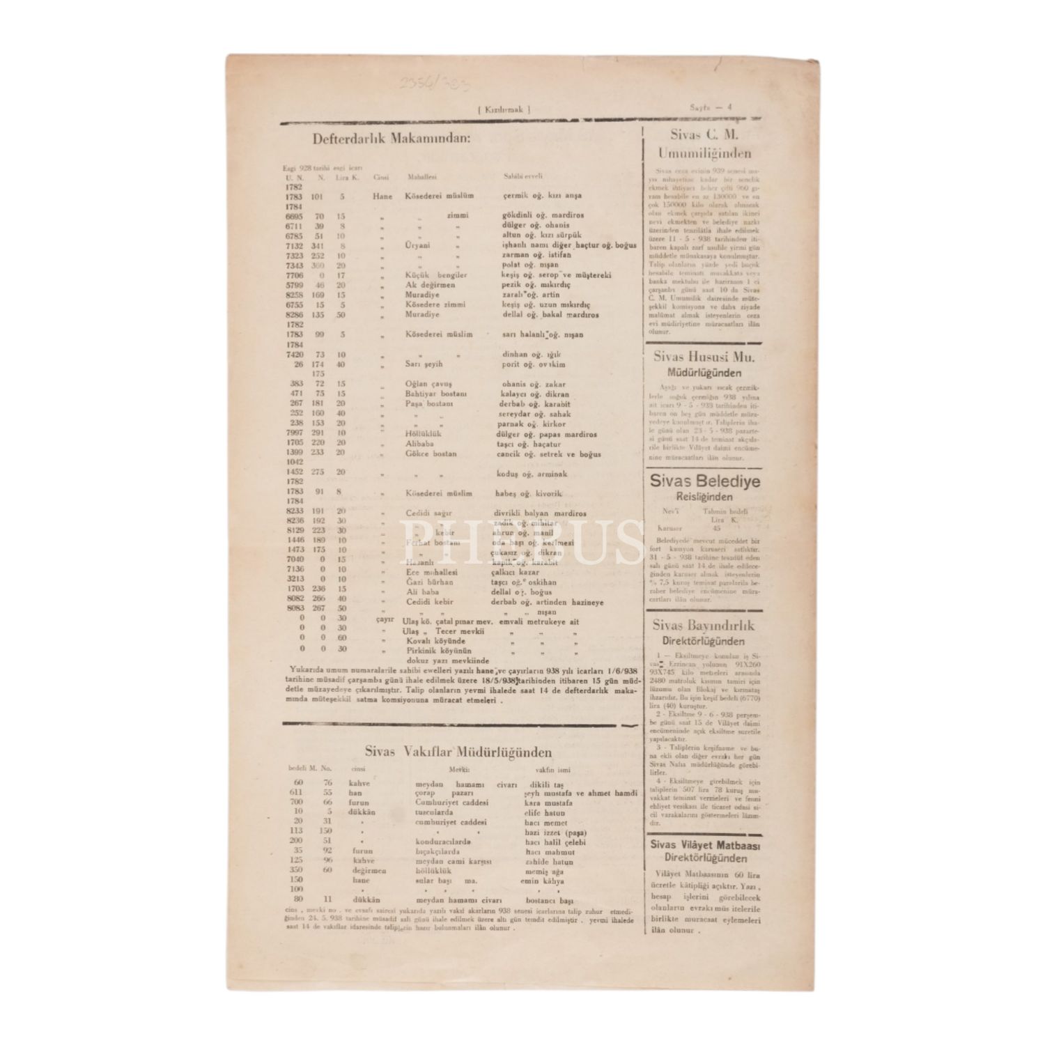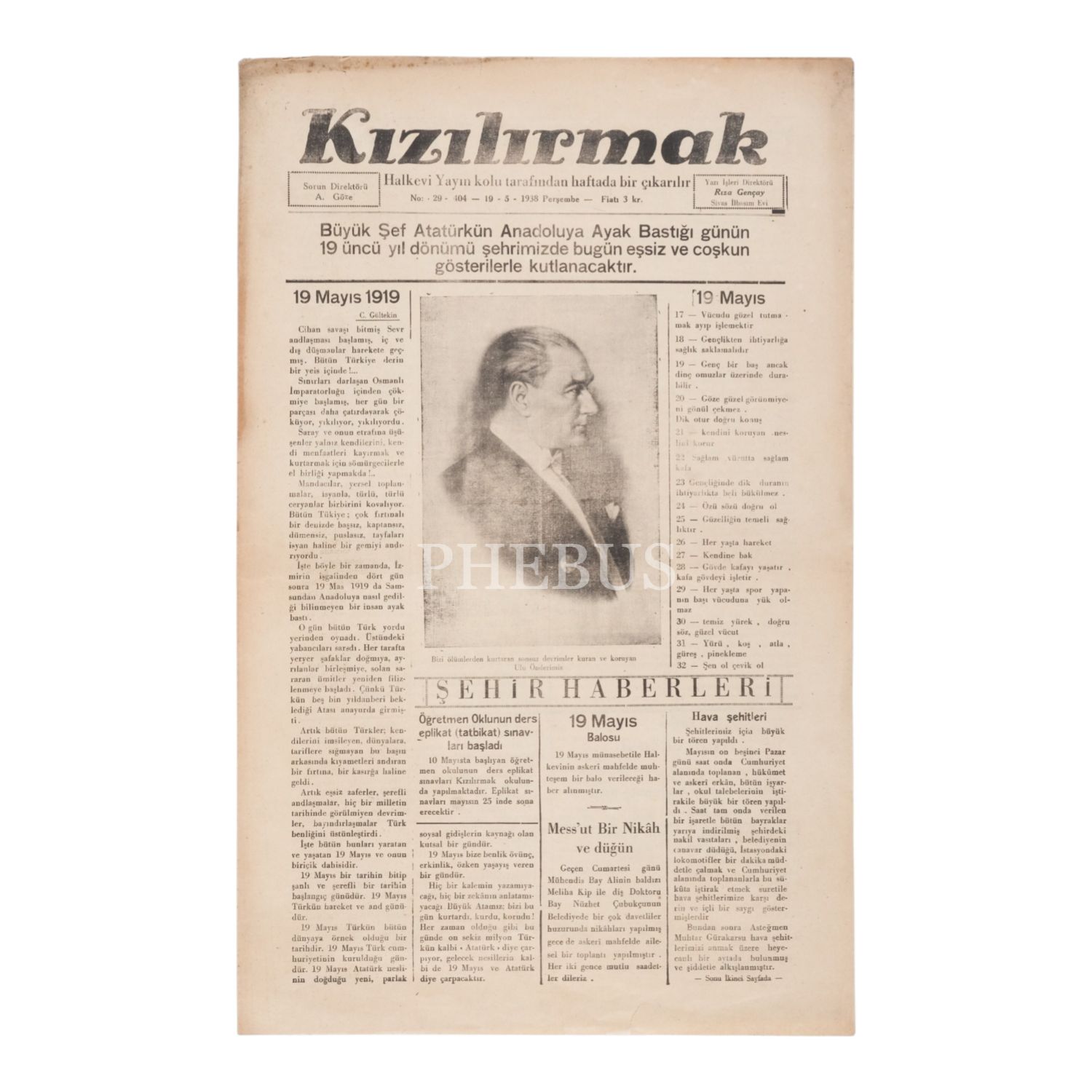 "Halkevi yayın kolu tarafından haftada bir çıkarılır" KIZILIRMAK gazetesinin, 19 Mayıs 1938 tarihli 29. sayısı, 4 sayfa, Sivas İlbasım Evi, 32x50 cm...