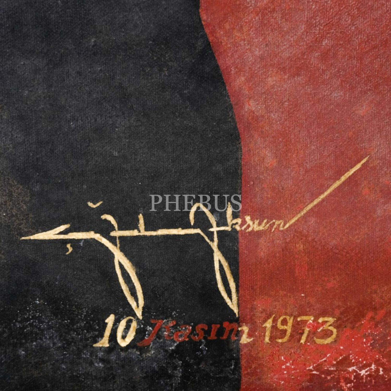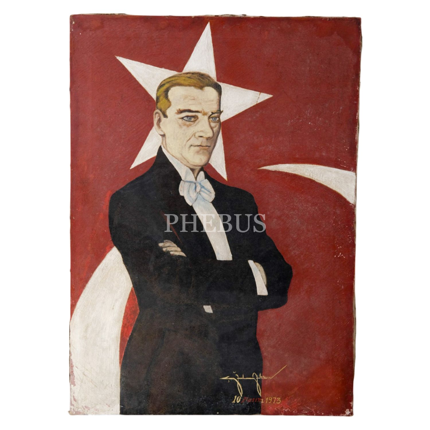 Mustafa Kemal Atatürk´ün, Türk bayrağı önünde tasvir edildiği yağlıboya tablo, sanatçı imzalı, 10 Kasım 1973, 50x70 cm...