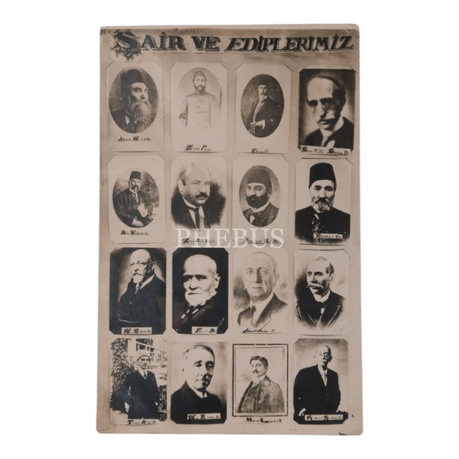 Ahmed Midhat Efendi´den Mahmut Sadık Bey´e, Türk edebiyatının 16 büyük şair ve edibinin fotoğrafının yer aldığı parçalı fotokart, 9x14 cm...