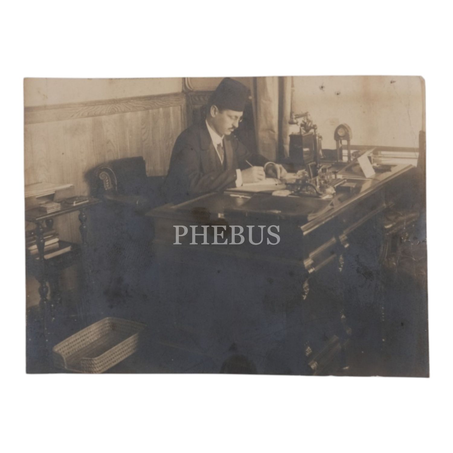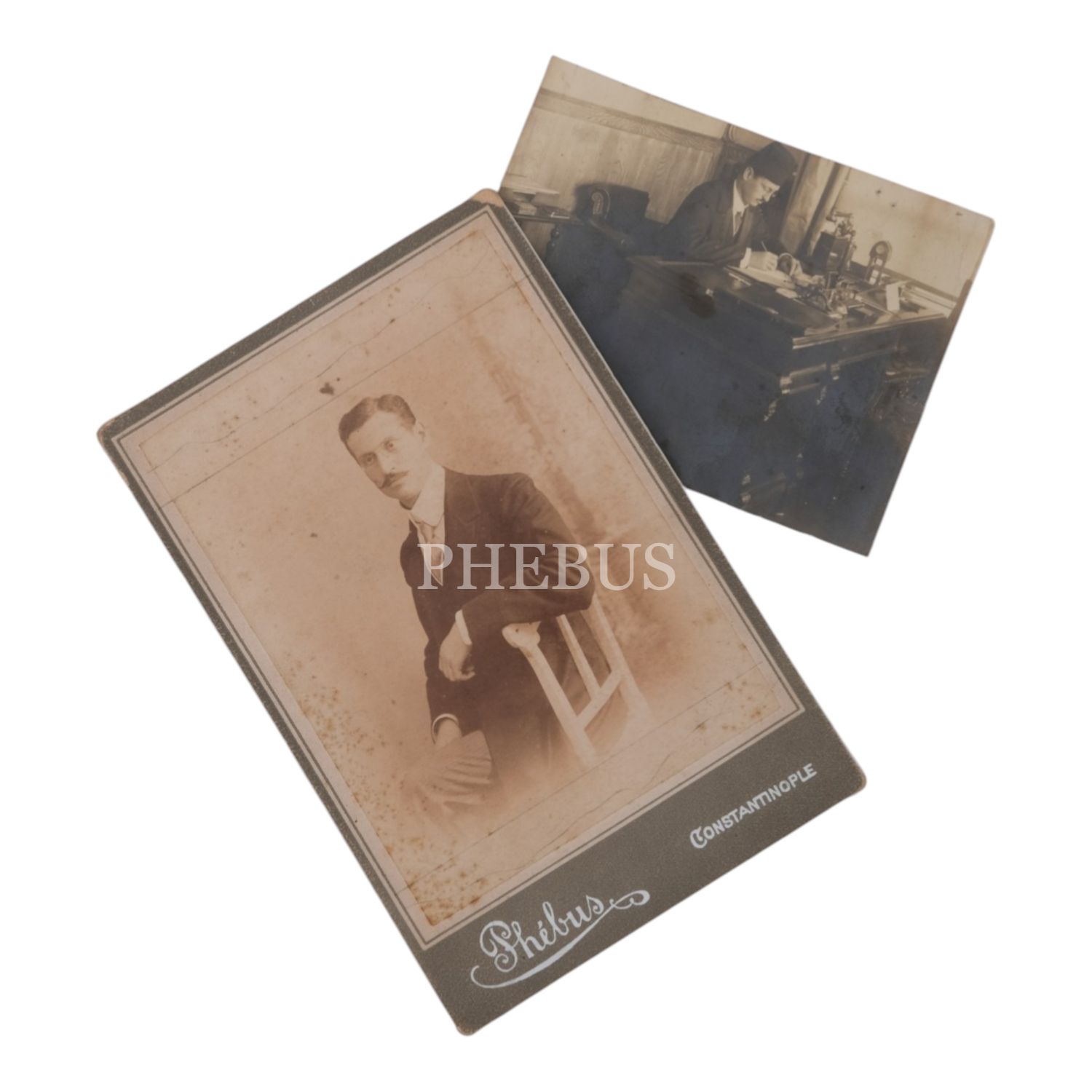 Bir beyefendinin, Phebus Fotoğrafhanesi´nde (Constantinople) aldırdığı portre fotoğrafıyla, makamında çalışırken çekilmiş bir başka fotoğrafı, 12x18 cm - 12x9 cm...