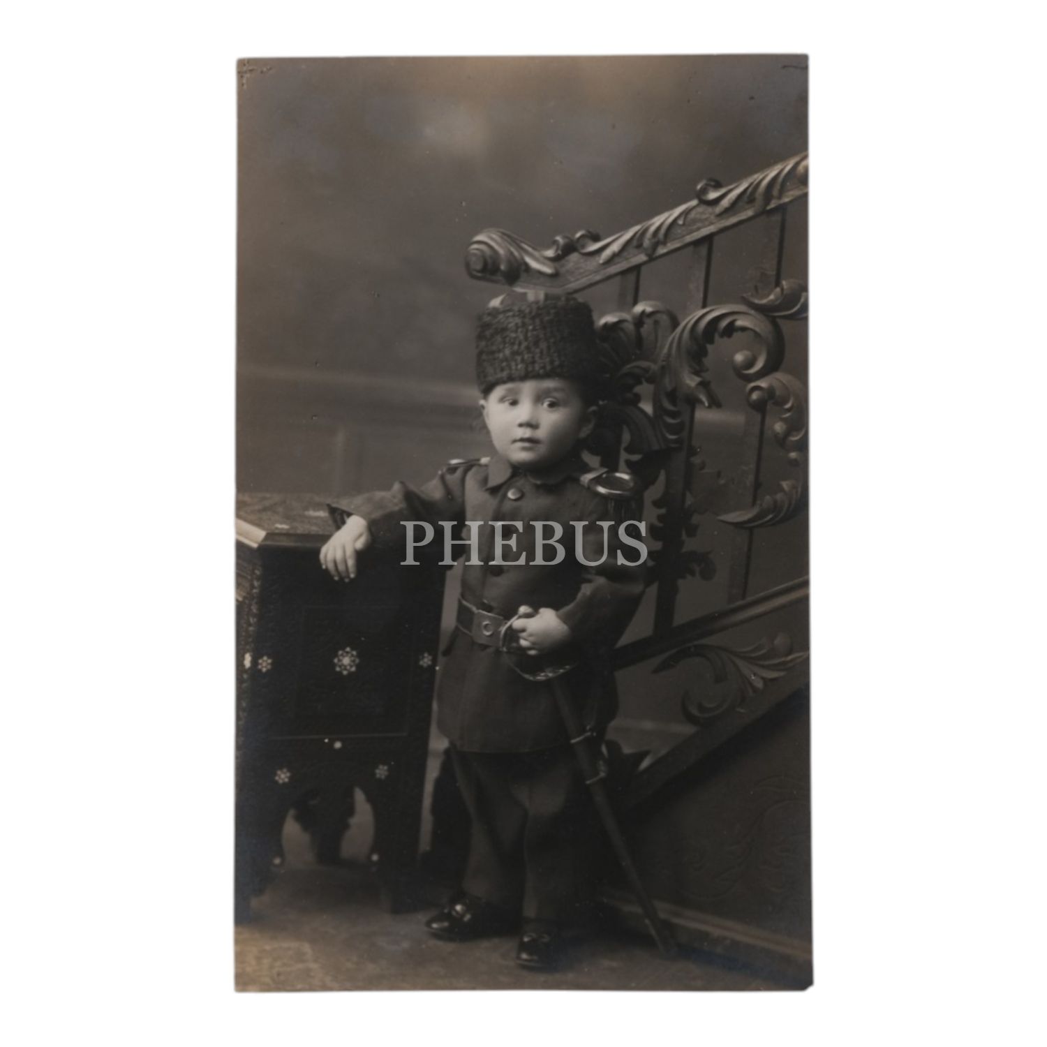 Askeri üniforması ve kılıcıyla kamera karşısına geçen minik bir subay, 9x14 cm...