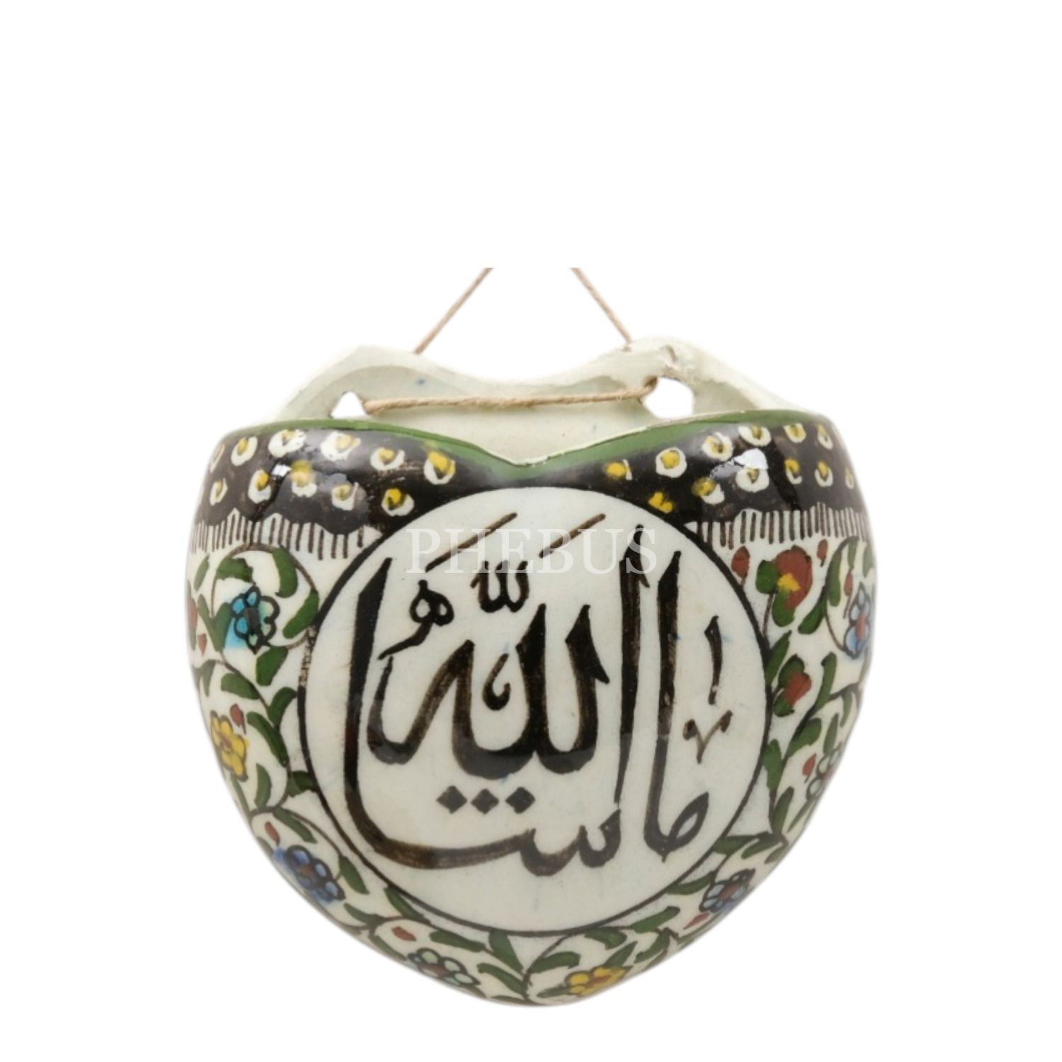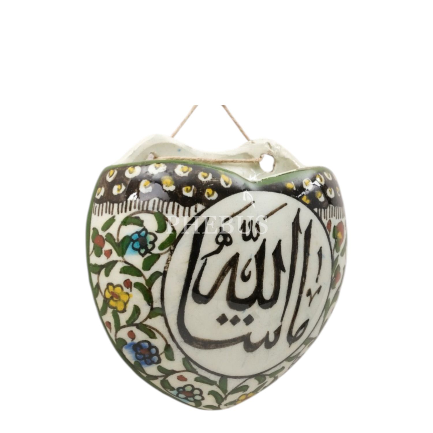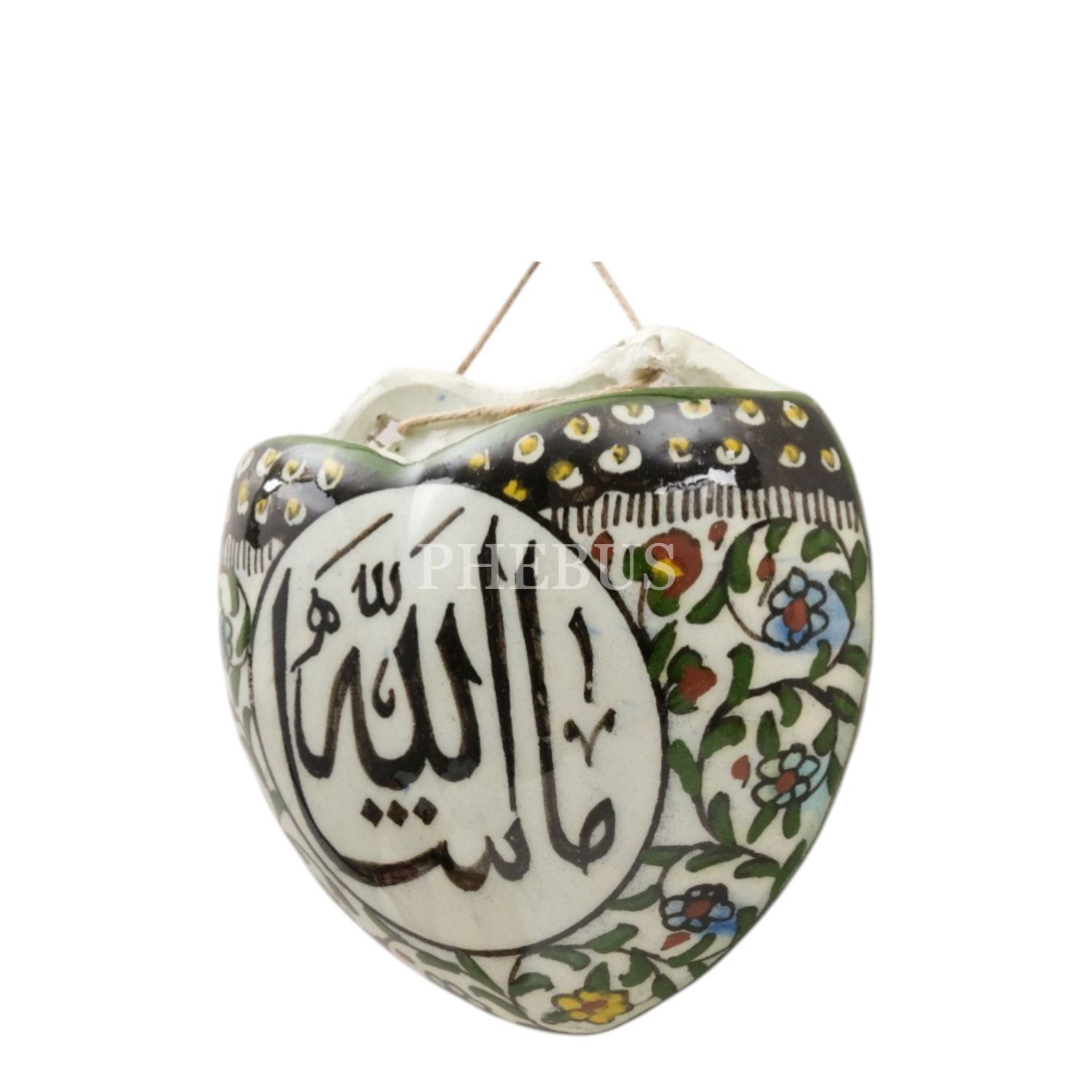 Üzerinde "Maşallah" yazılı, geleneksel ve floral desenlerle bezeli, kalp şeklindeki porselen süs objesi,11x11 cm...