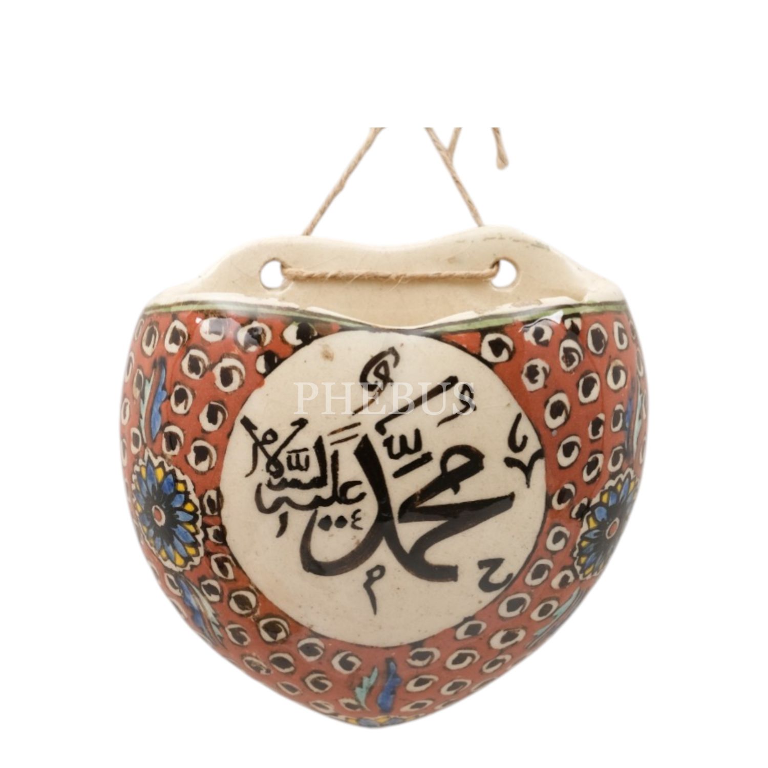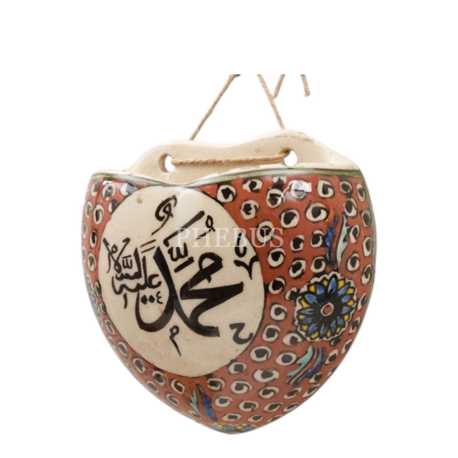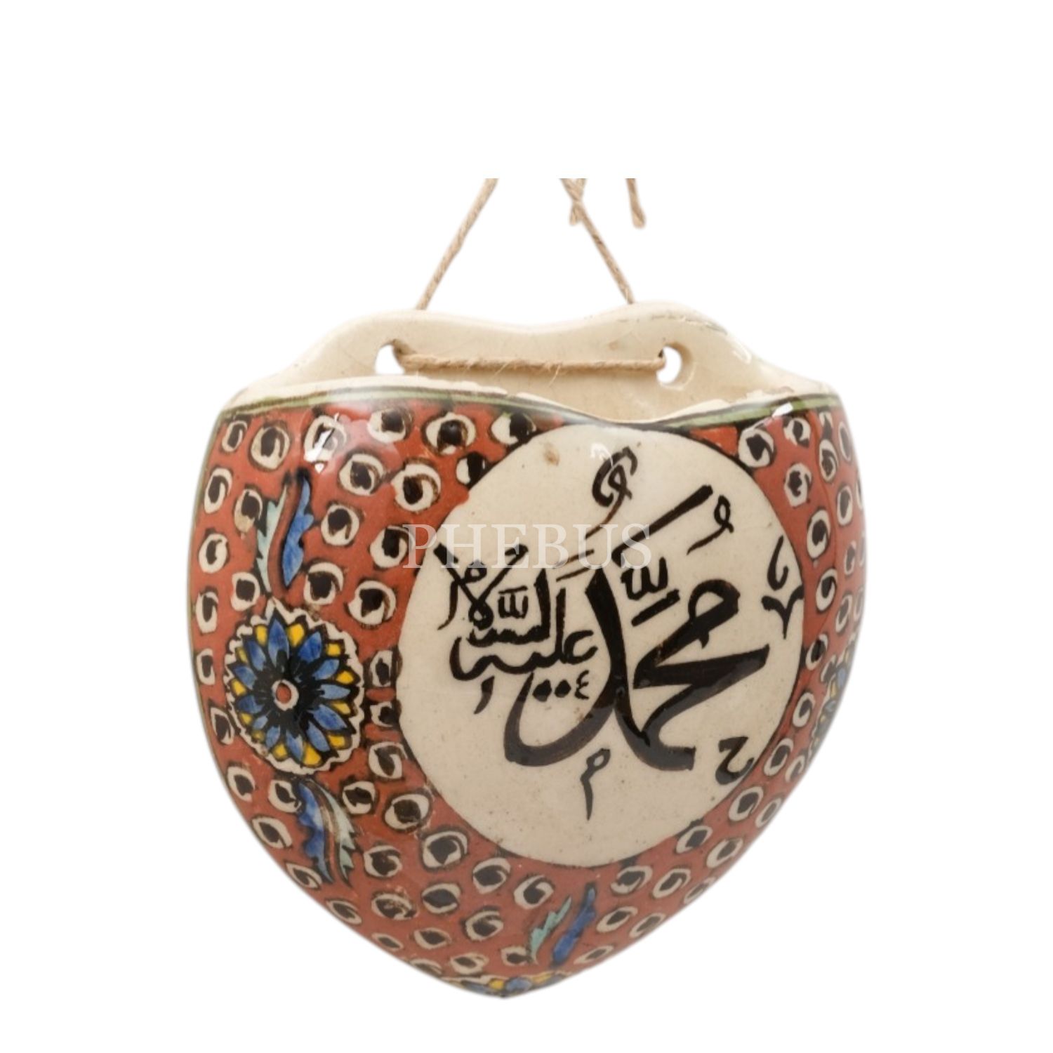Üzerinde "Maşallah" yazılı, geleneksel ve floral desenlerle bezeli, kalp şeklindeki porselen süs objesi,11x11 cm...