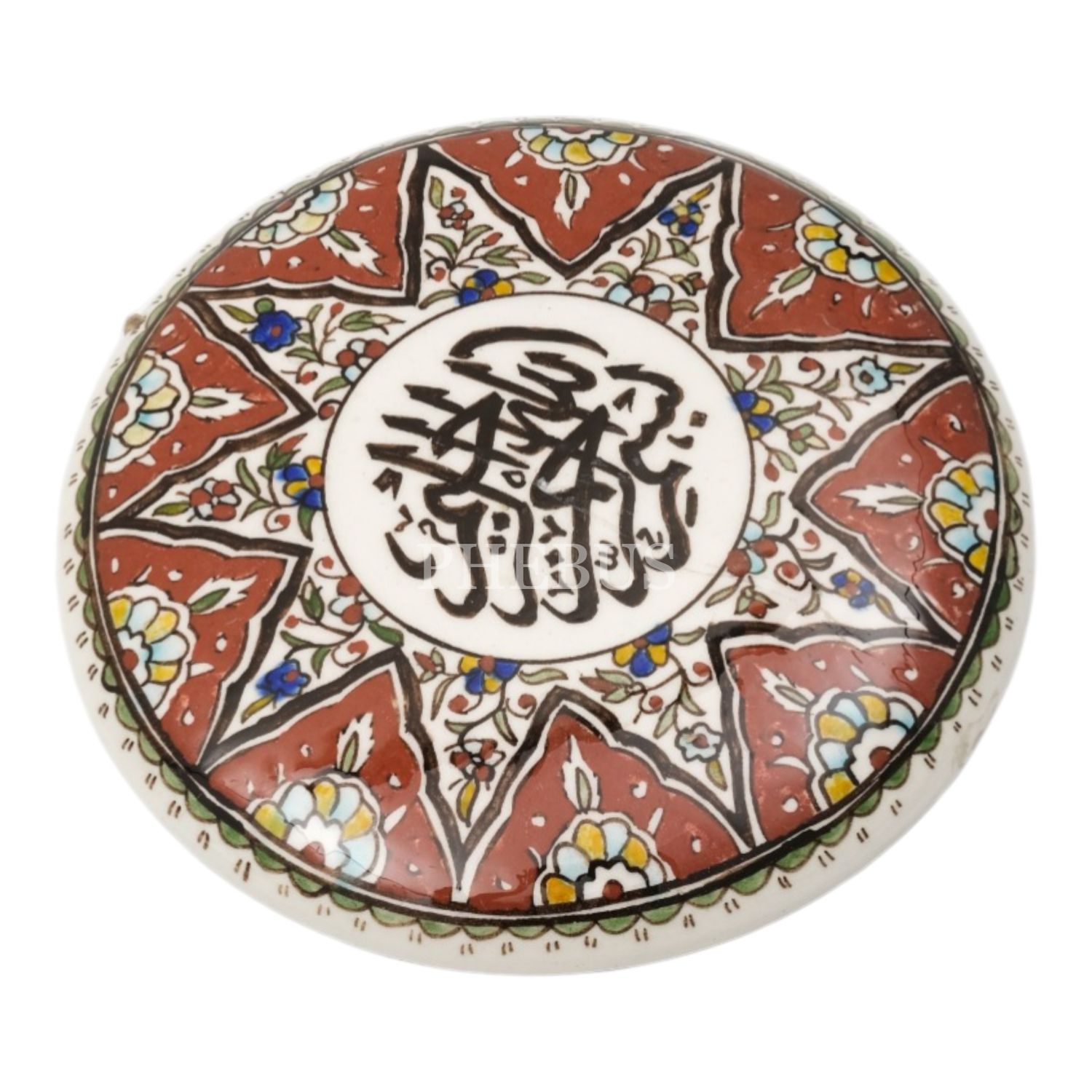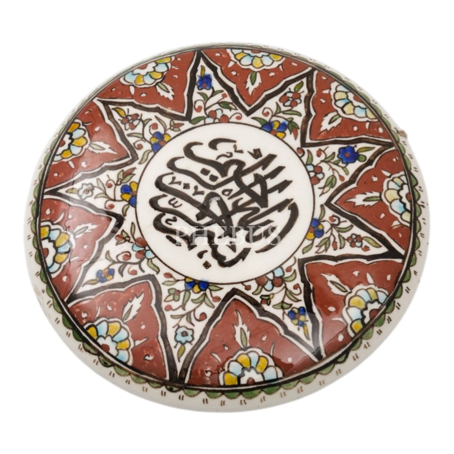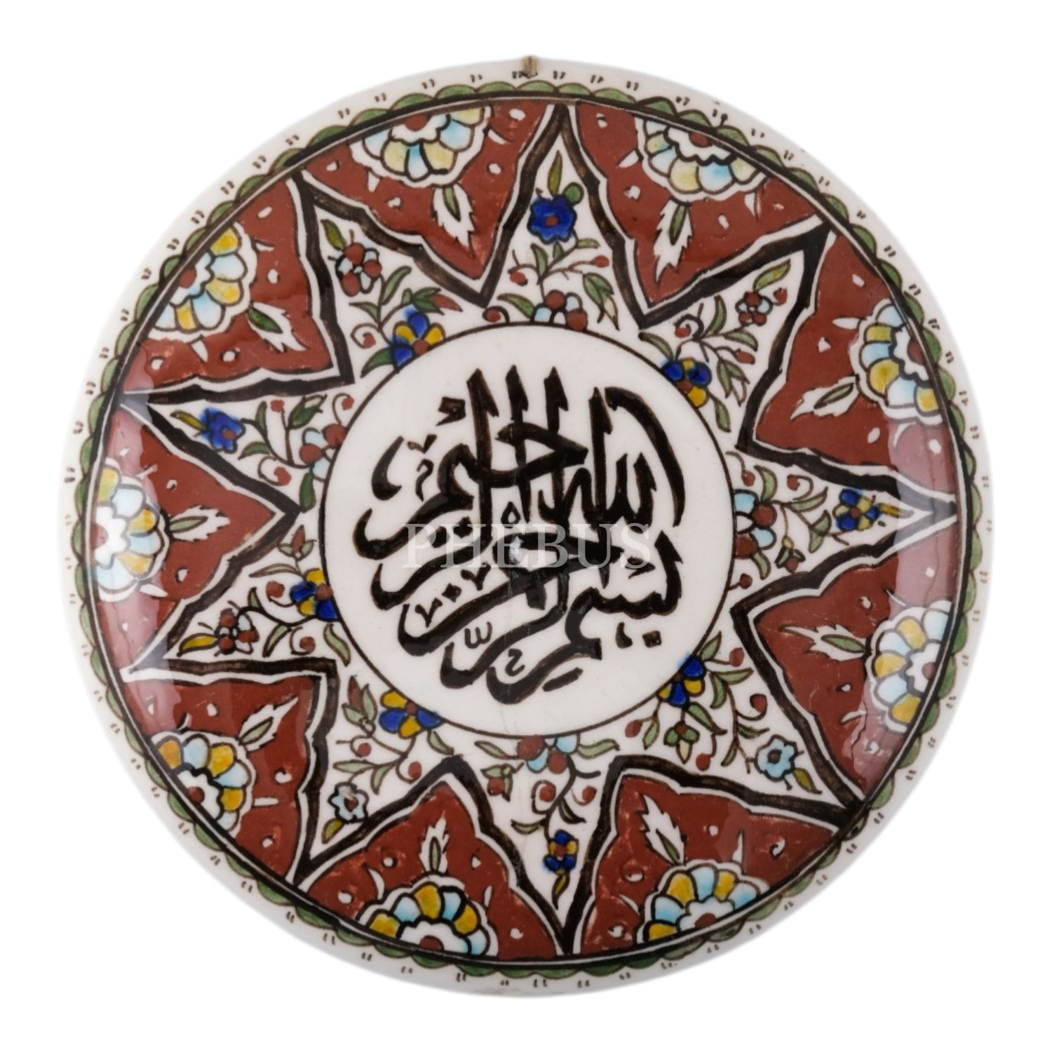 Üzerinde "Bismillahirrahmanirrahim" yazılı, geleneksel ve floral desenlerle bezeli, porselen süs objesi, çap 22 cm...