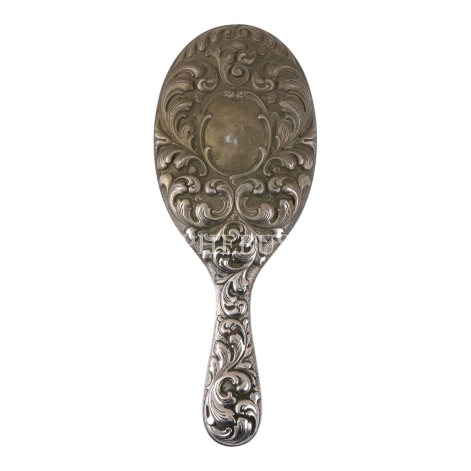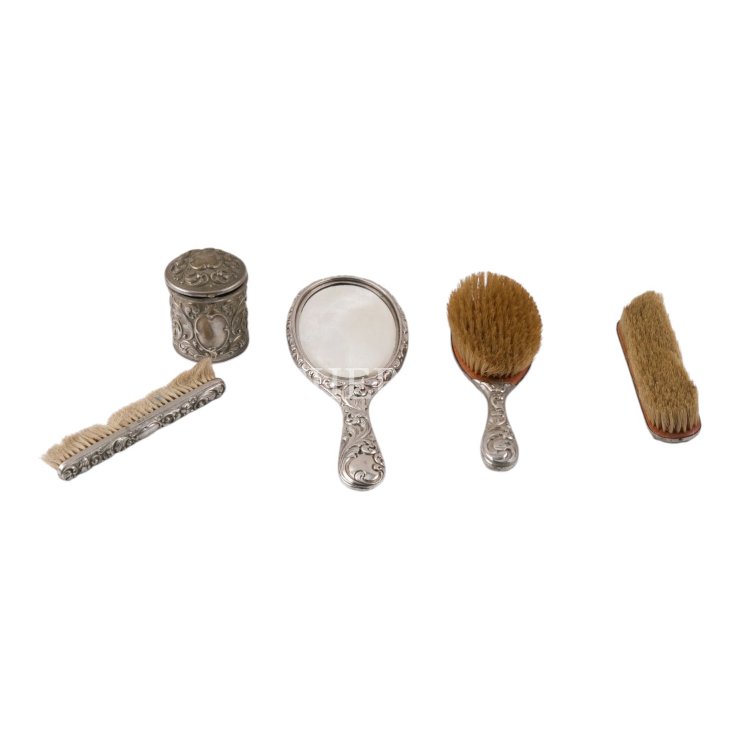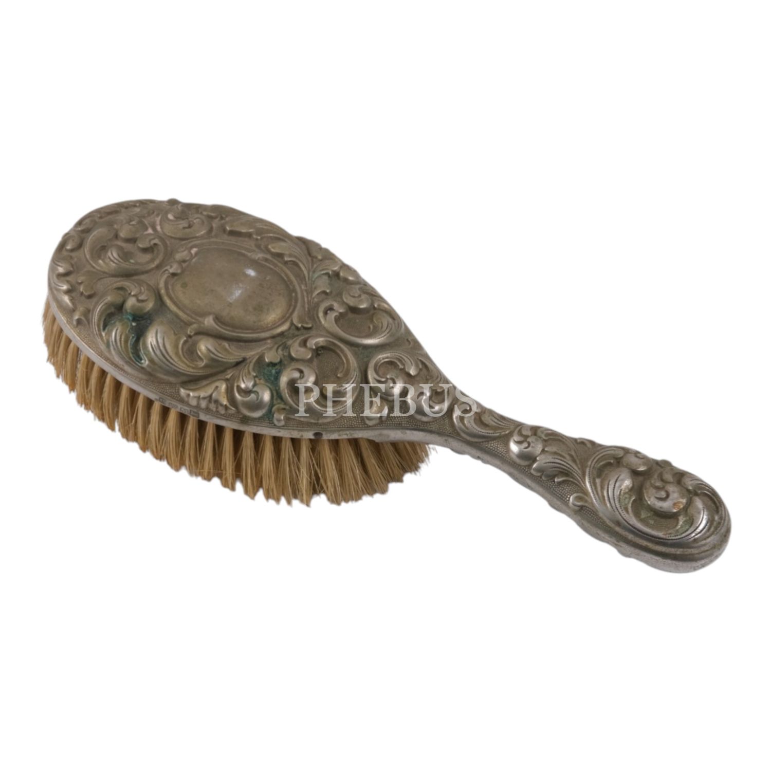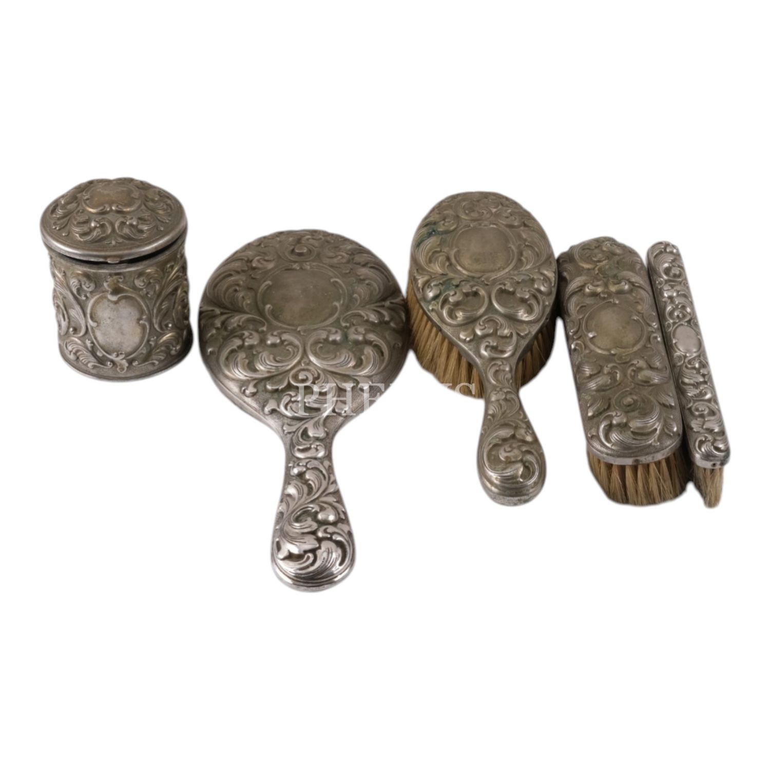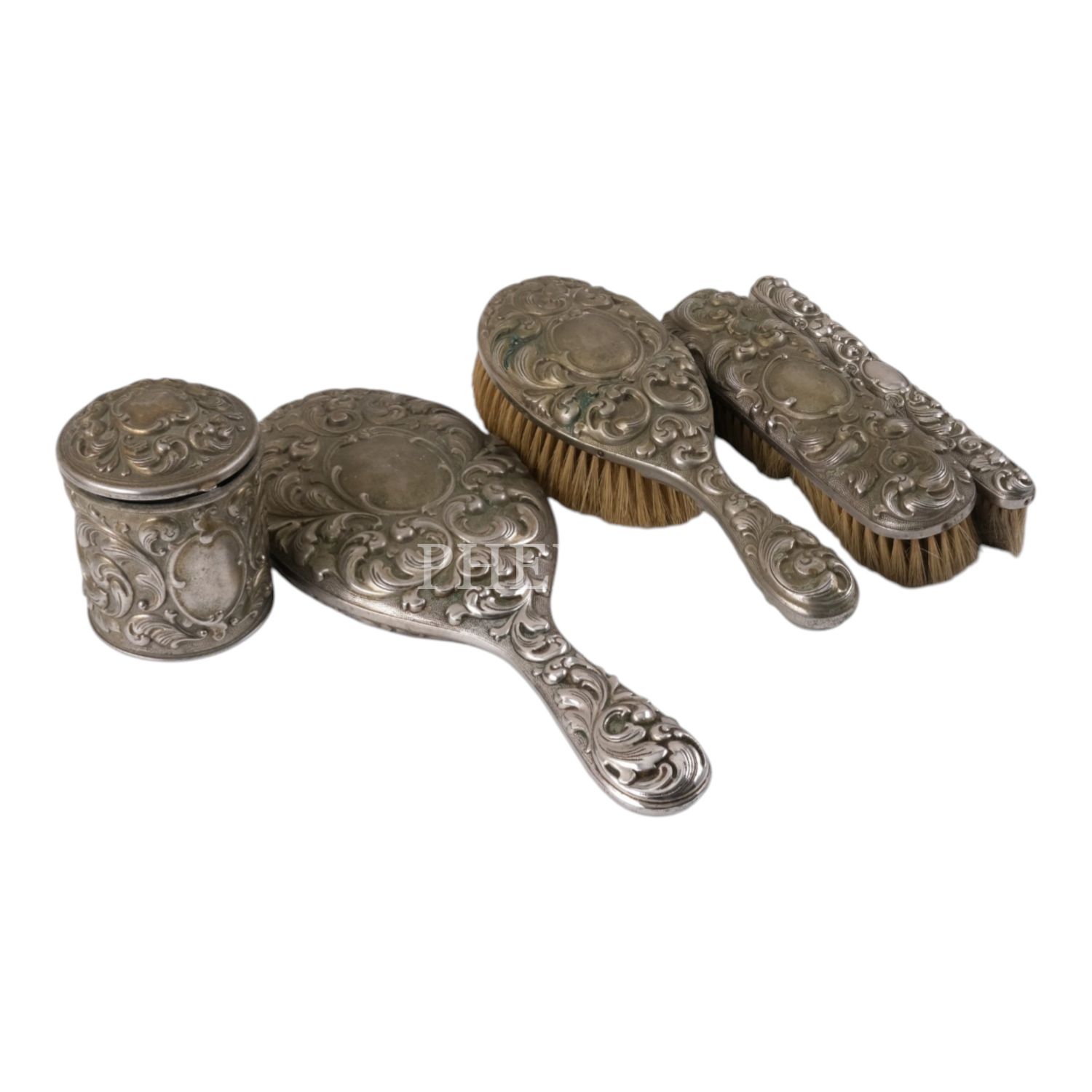 Ayna, tarak, fırça ve pudra kutusundan oluşan 5 parçalık, alpaka (Alman gümüşü) çeyiz seti...