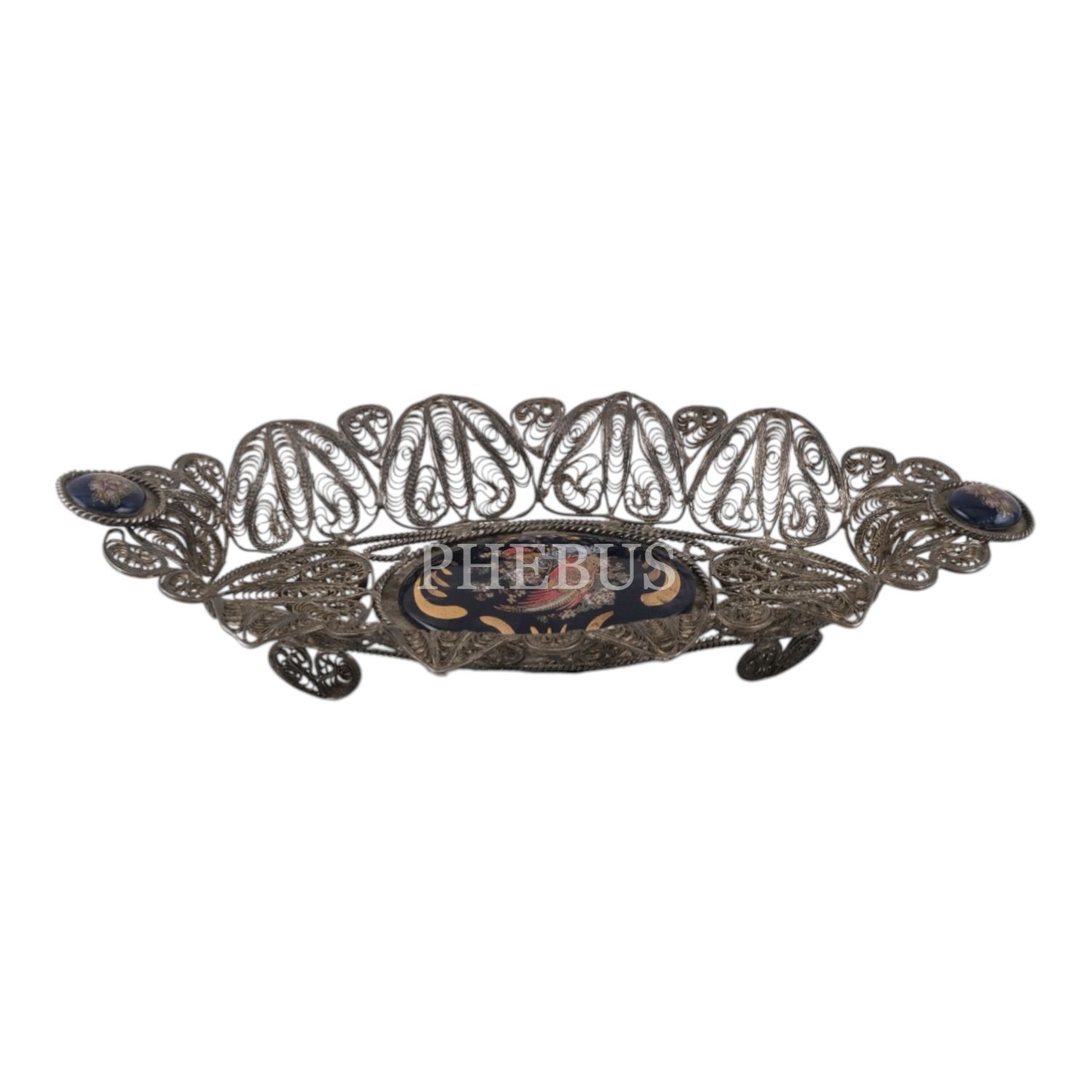 Merkezinde kuş figürü yer alan metal tepsi, 36x18 cm...