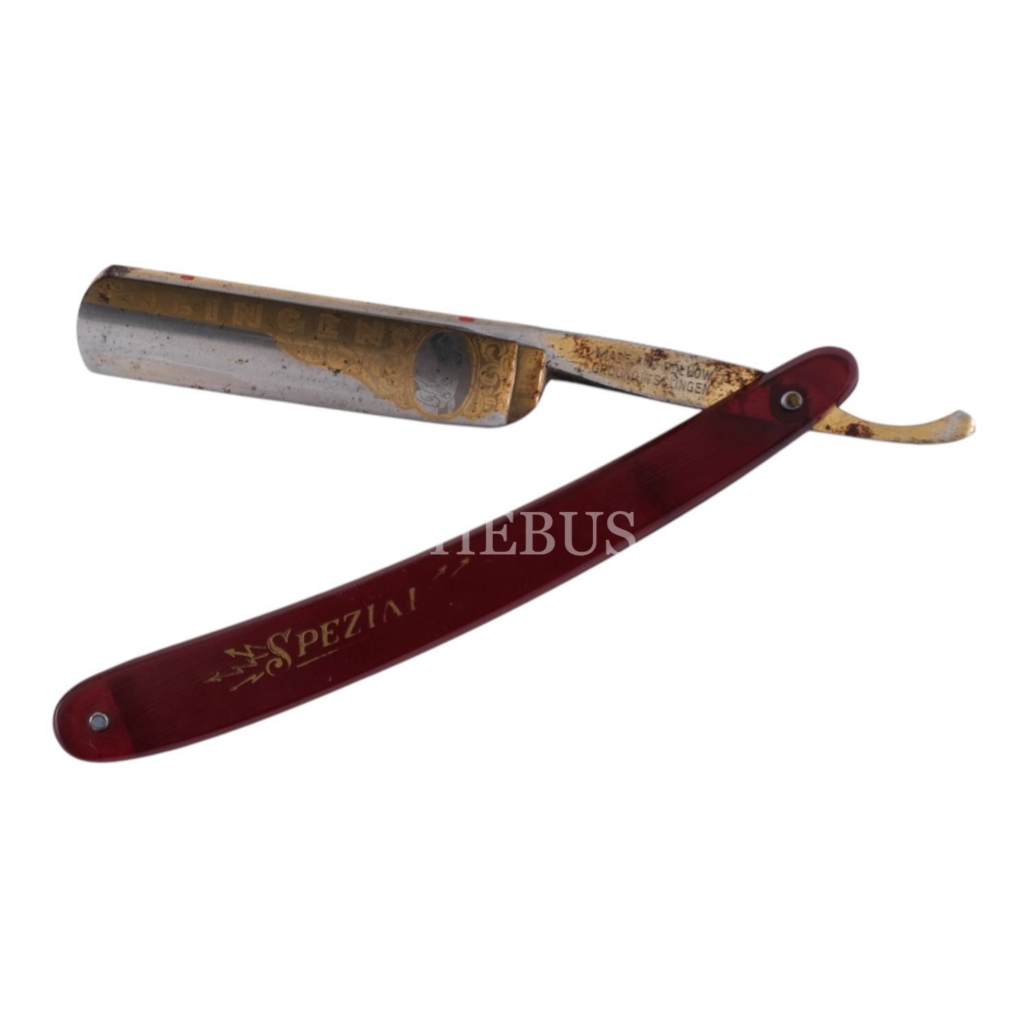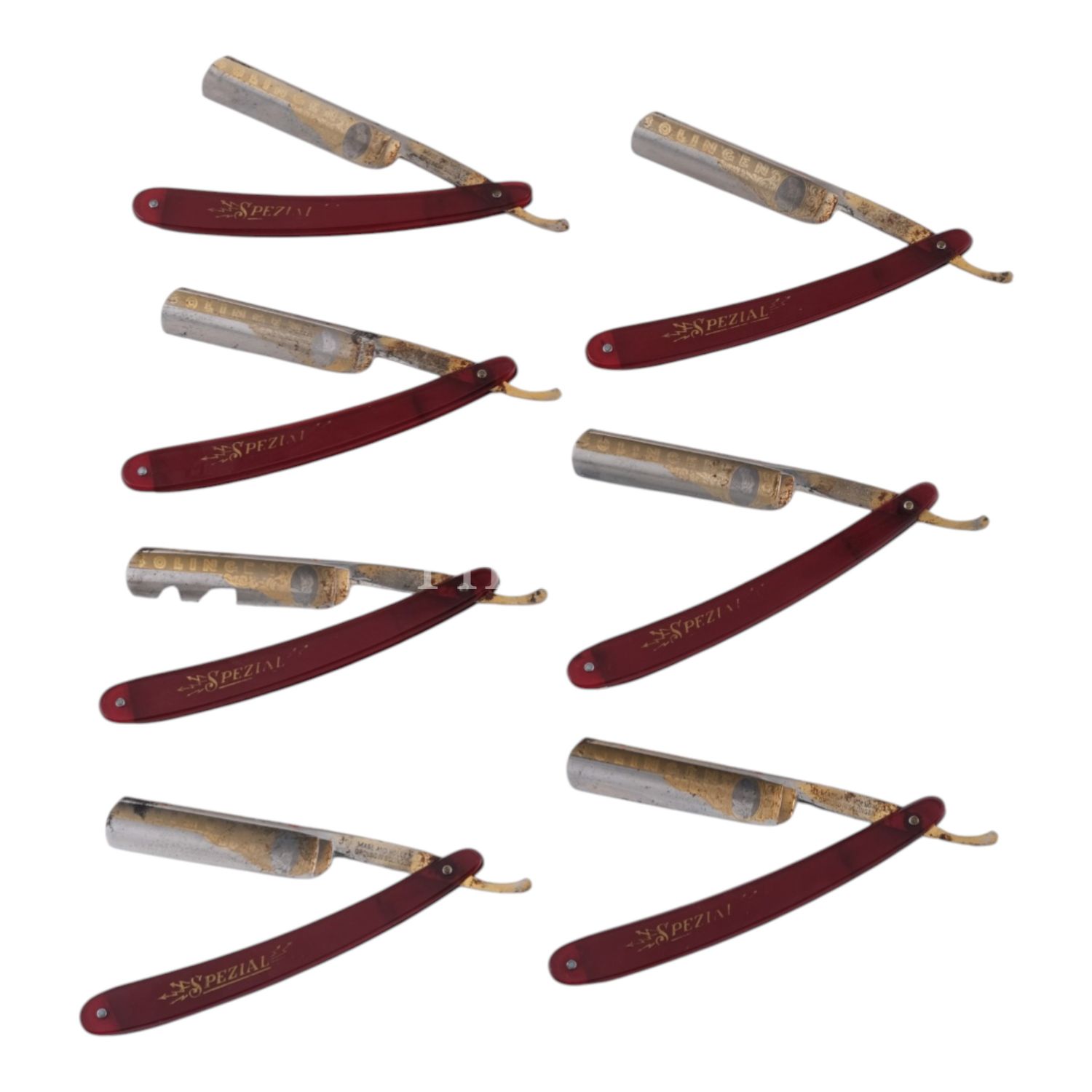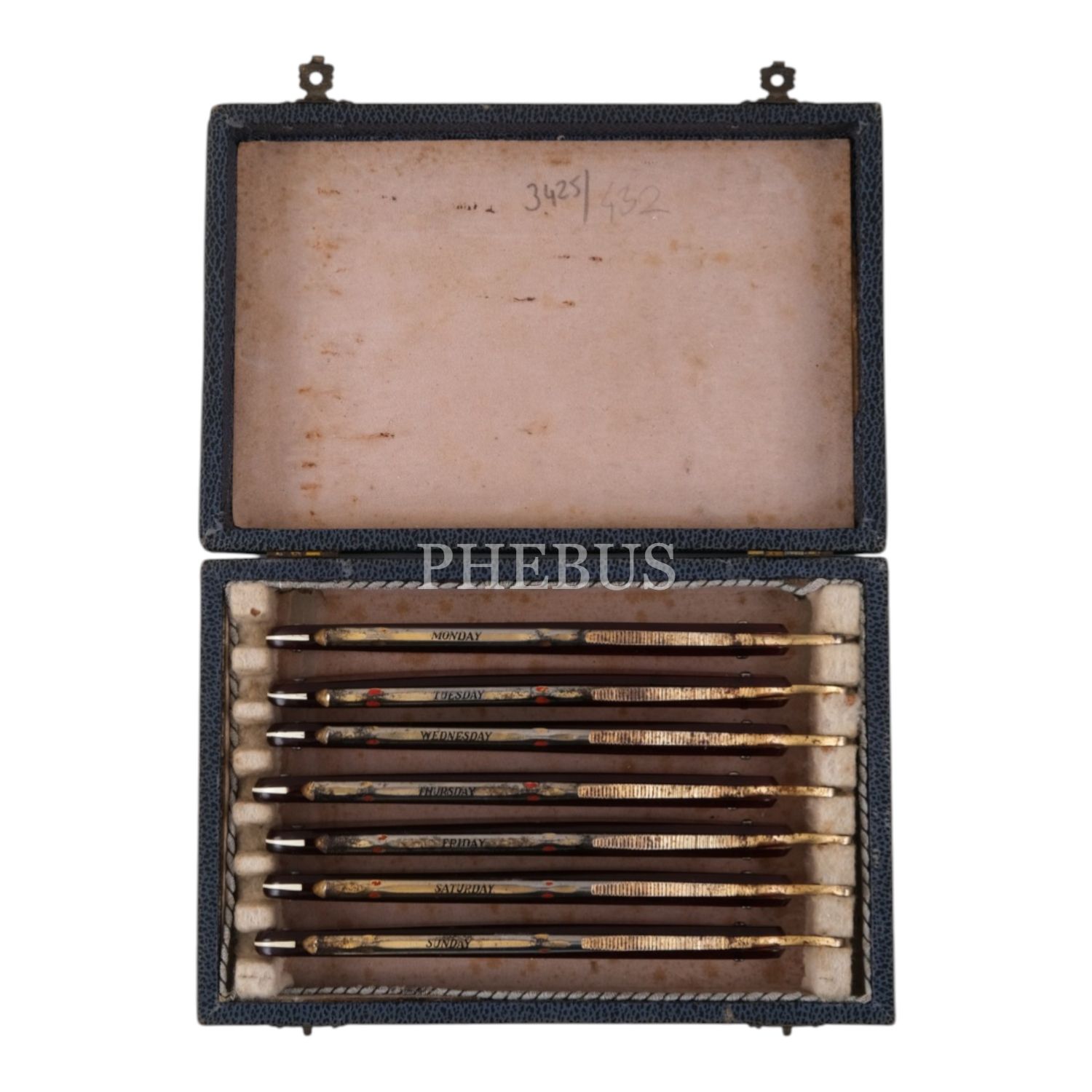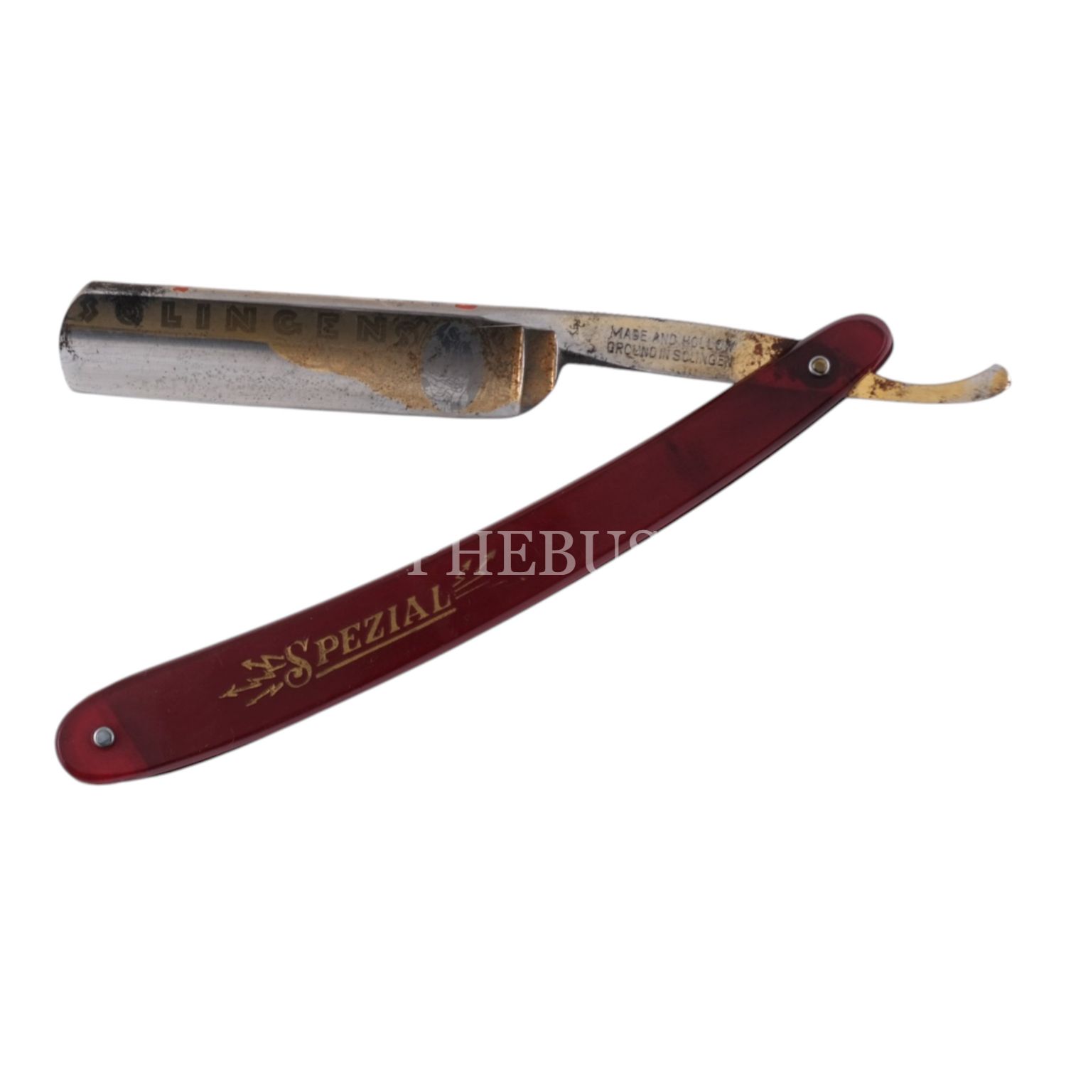 "Solingen" marka, "Spezial" yazılı kırmızı saplı, sırt kısımlarında İngilizce haftanın günleri yazılı, orijinal kutusunda 7 gün ustura takımı, 12x18 cm...