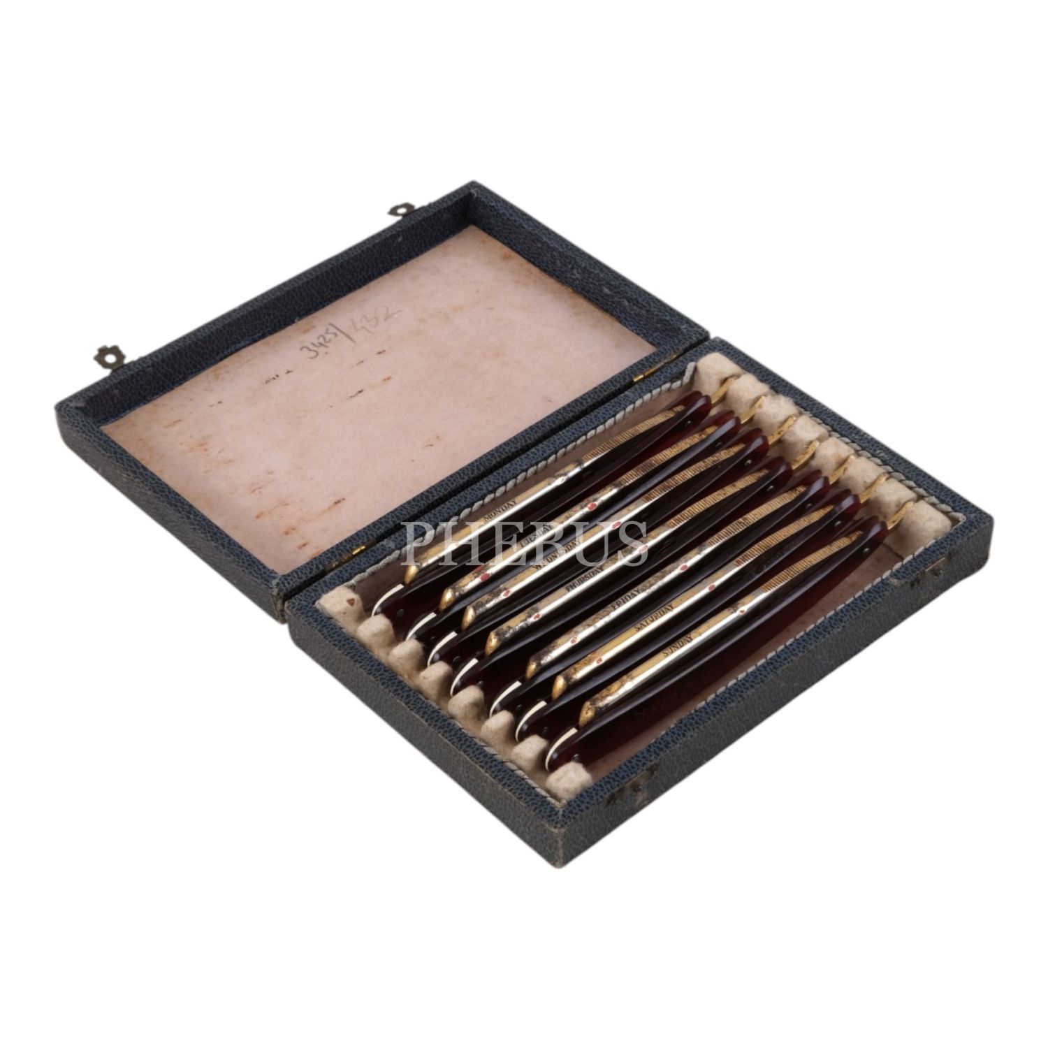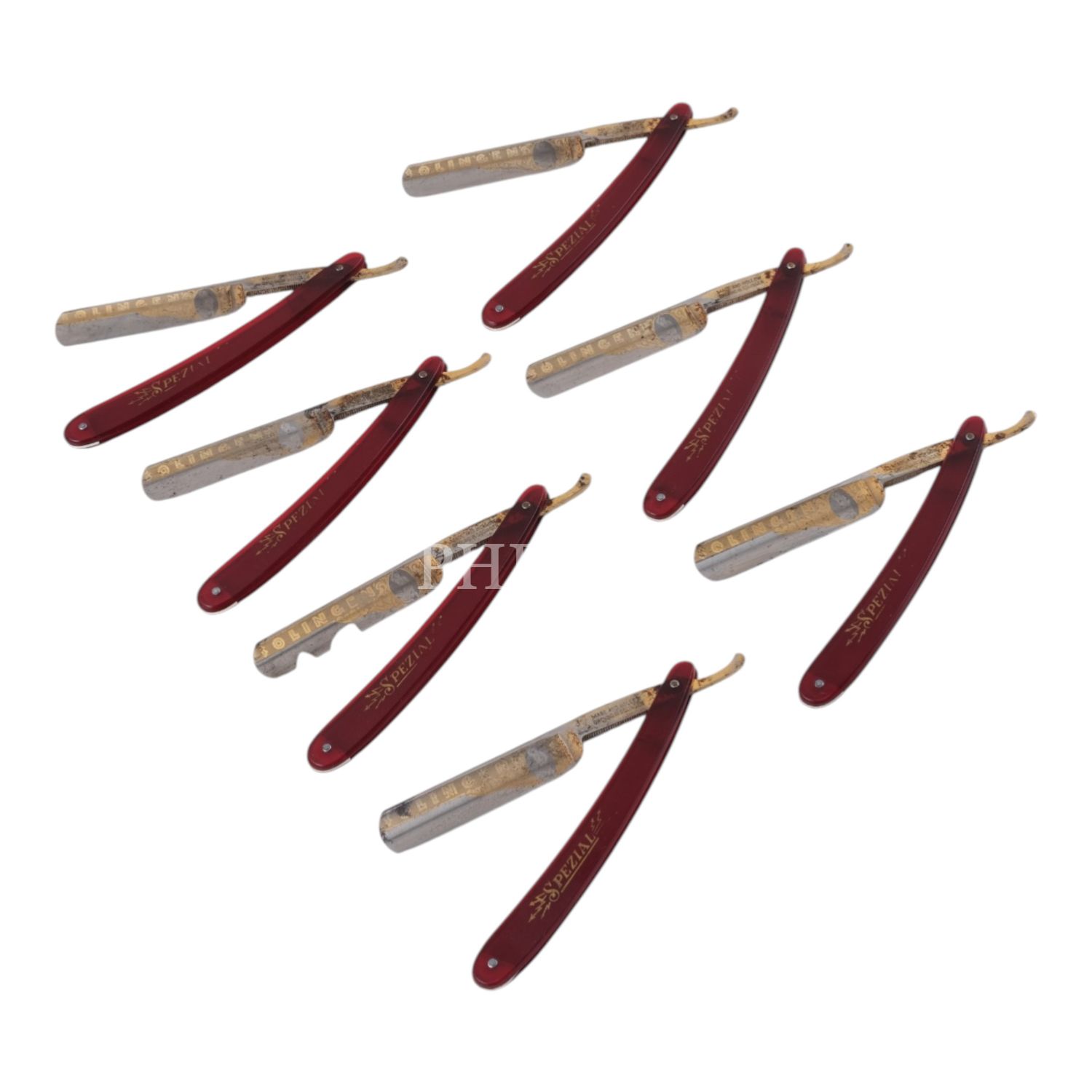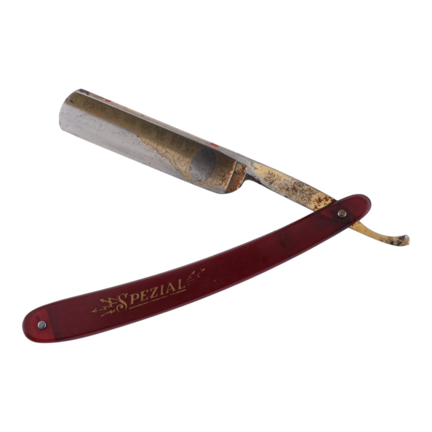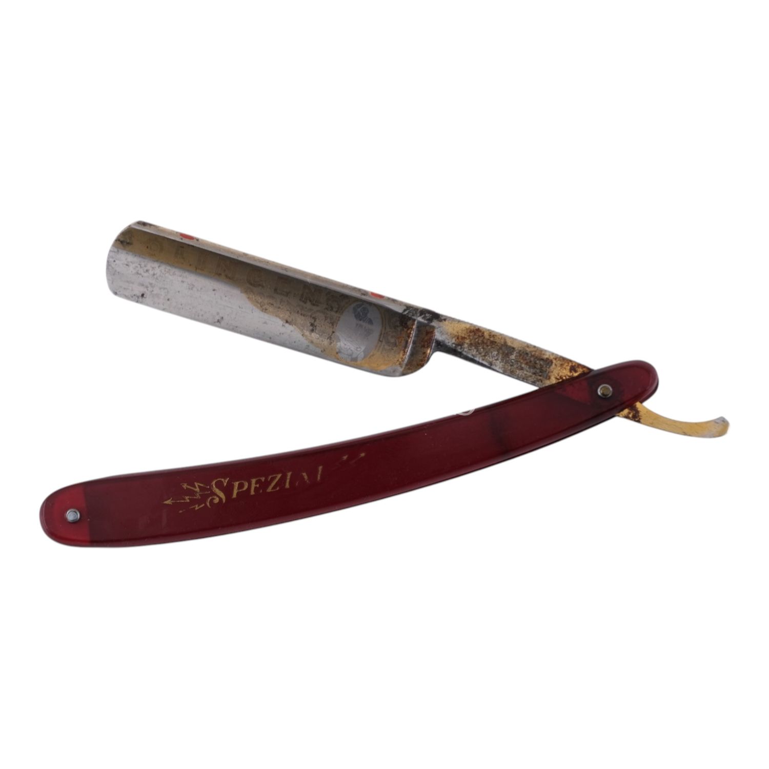 "Solingen" marka, "Spezial" yazılı kırmızı saplı, sırt kısımlarında İngilizce haftanın günleri yazılı, orijinal kutusunda 7 gün ustura takımı, 12x18 cm...
