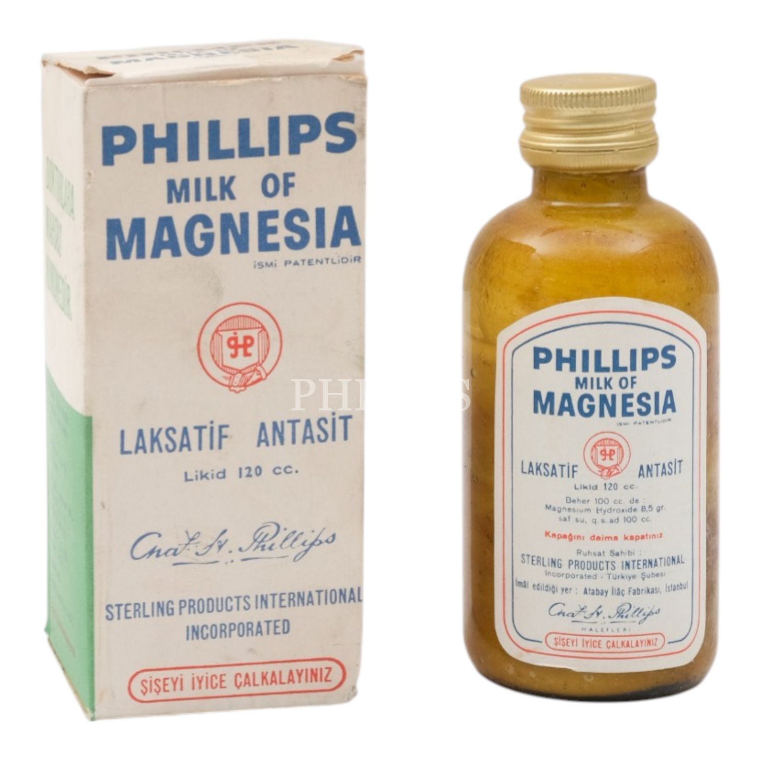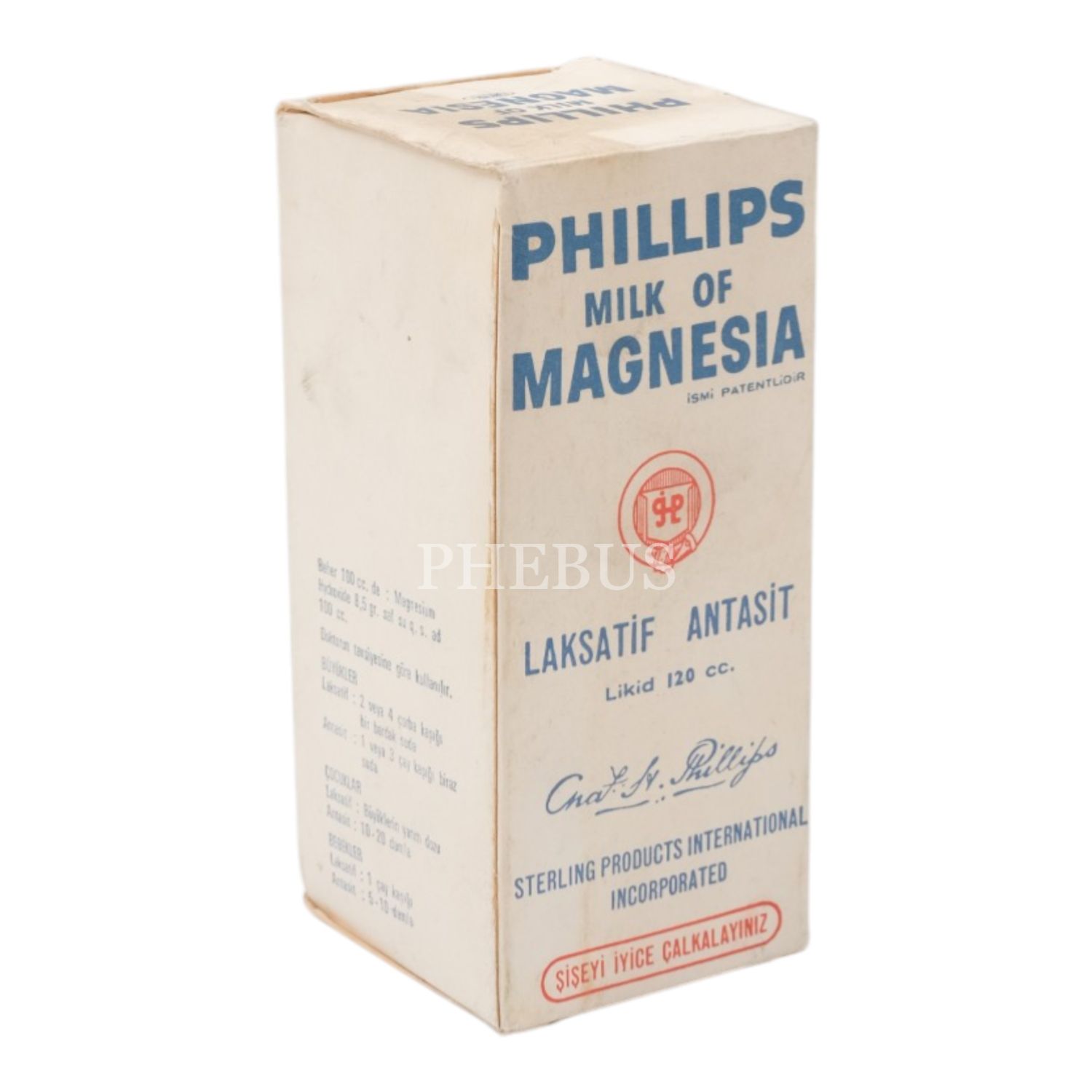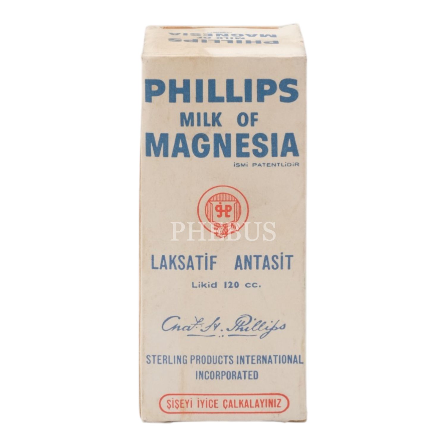 Prospektüsün yer aldığı orijinal kutusunda, Phillips Milk of Magnesia (Laksatif Antasit) şişesi (yarısından fazlası -katılaşmış halde- dolu), "Doktorlara Mahsus Numunedir." ibareli, imal yeri: Atabay İlâç Fabrikası - İstanbul, 5,5x12x5,5 cm...