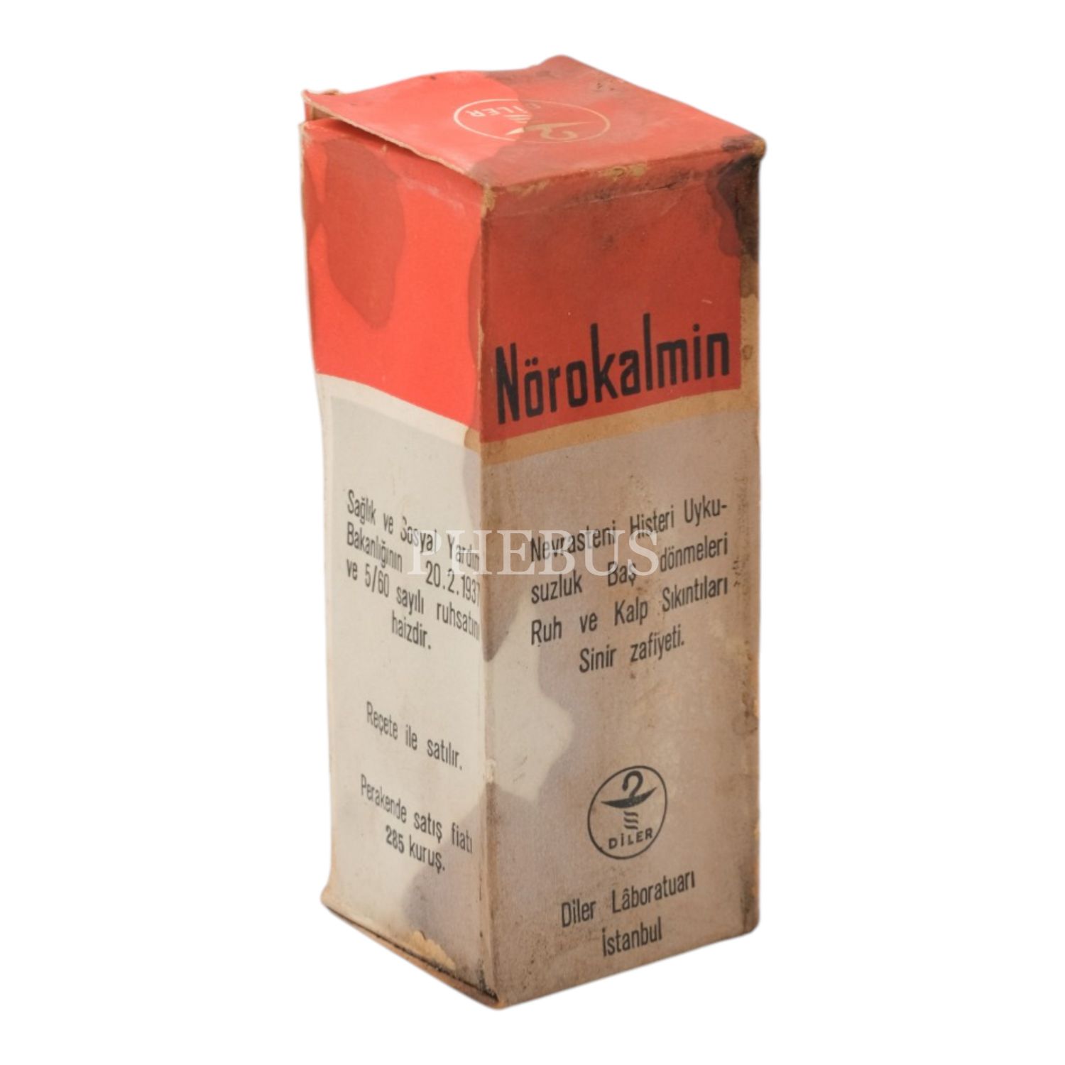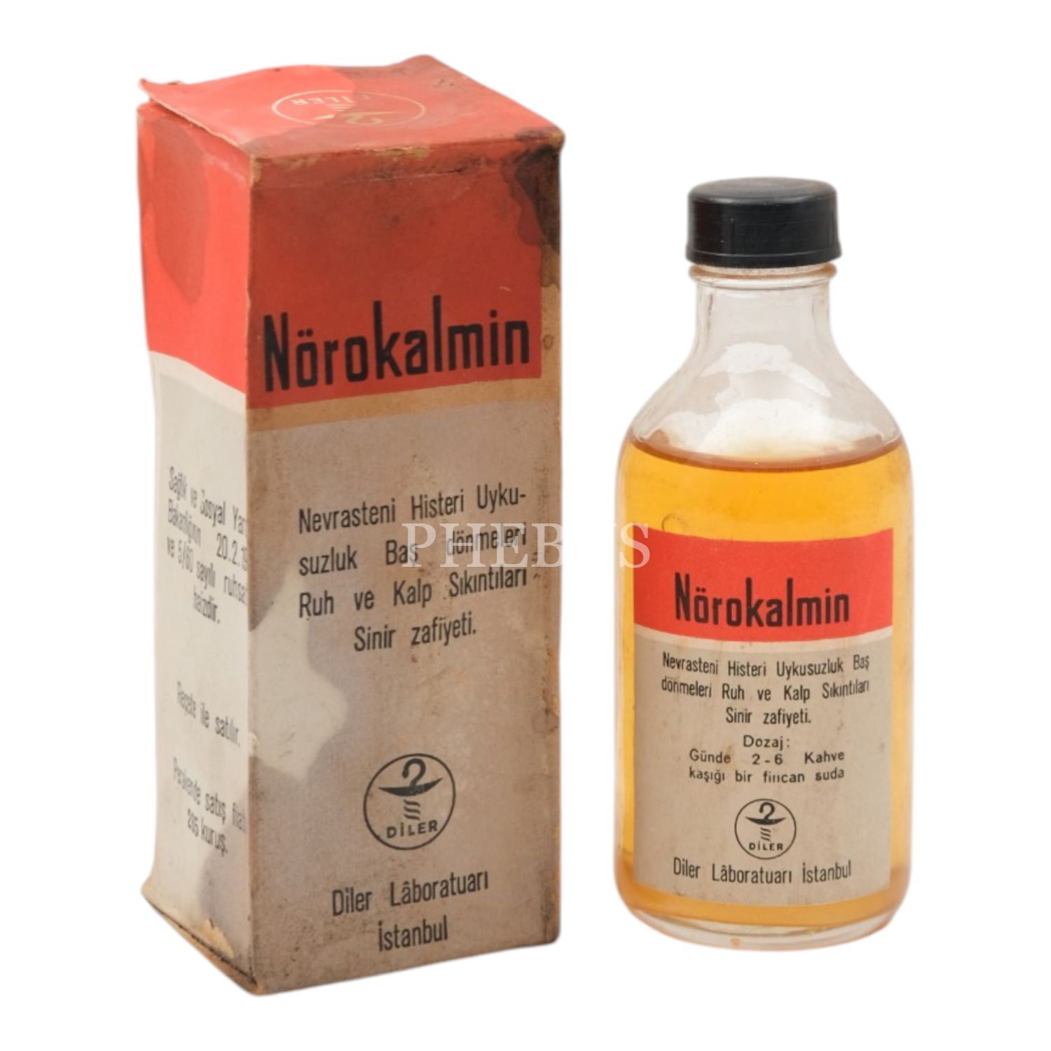 Prospektüsün yer aldığı orijinal kutusunda, Nörokalmin şişesi (yarısından fazlası dolu), Dilber Lâboratuarı - İstanbul, kutu ölçüsü 5,5x13,5x5,5 cm...