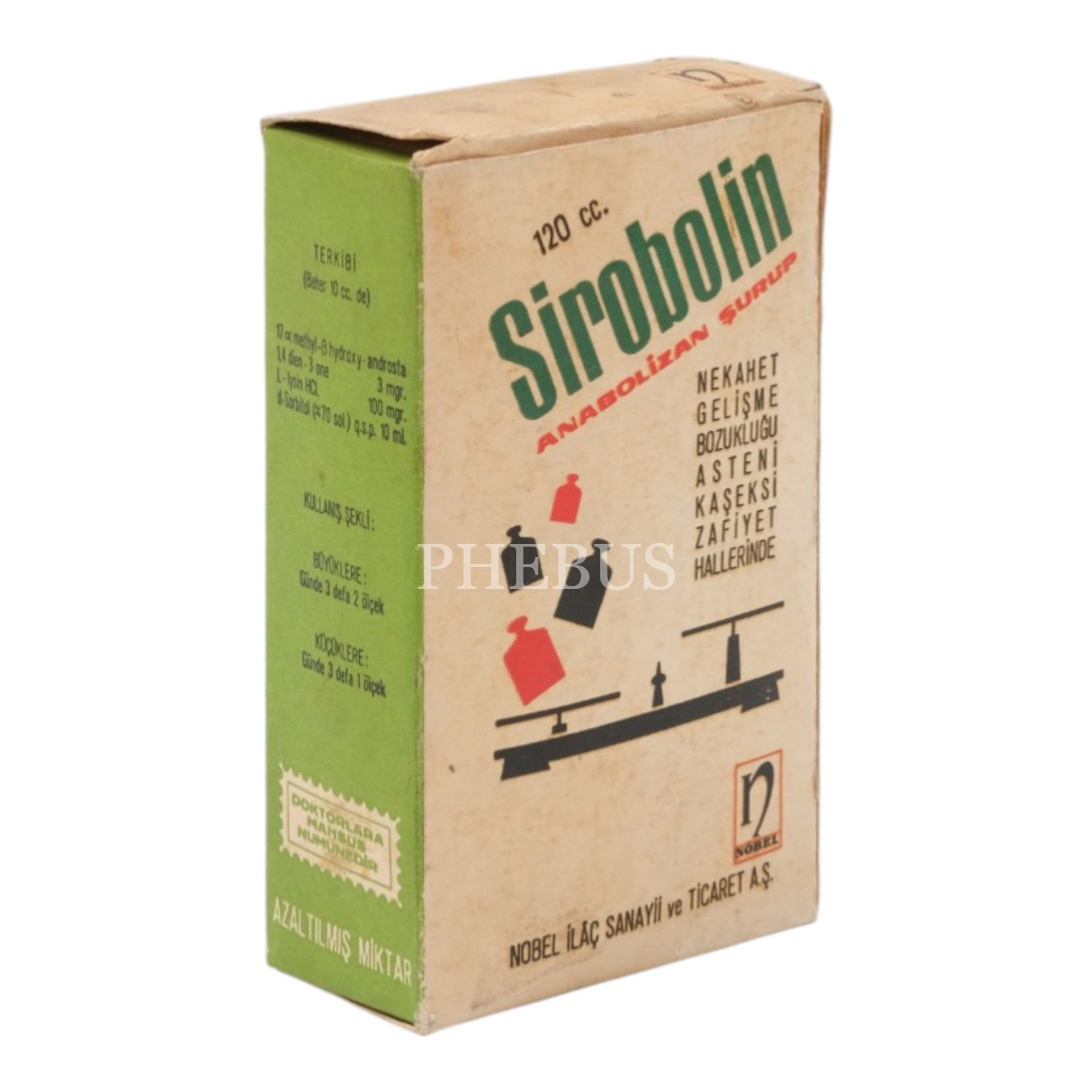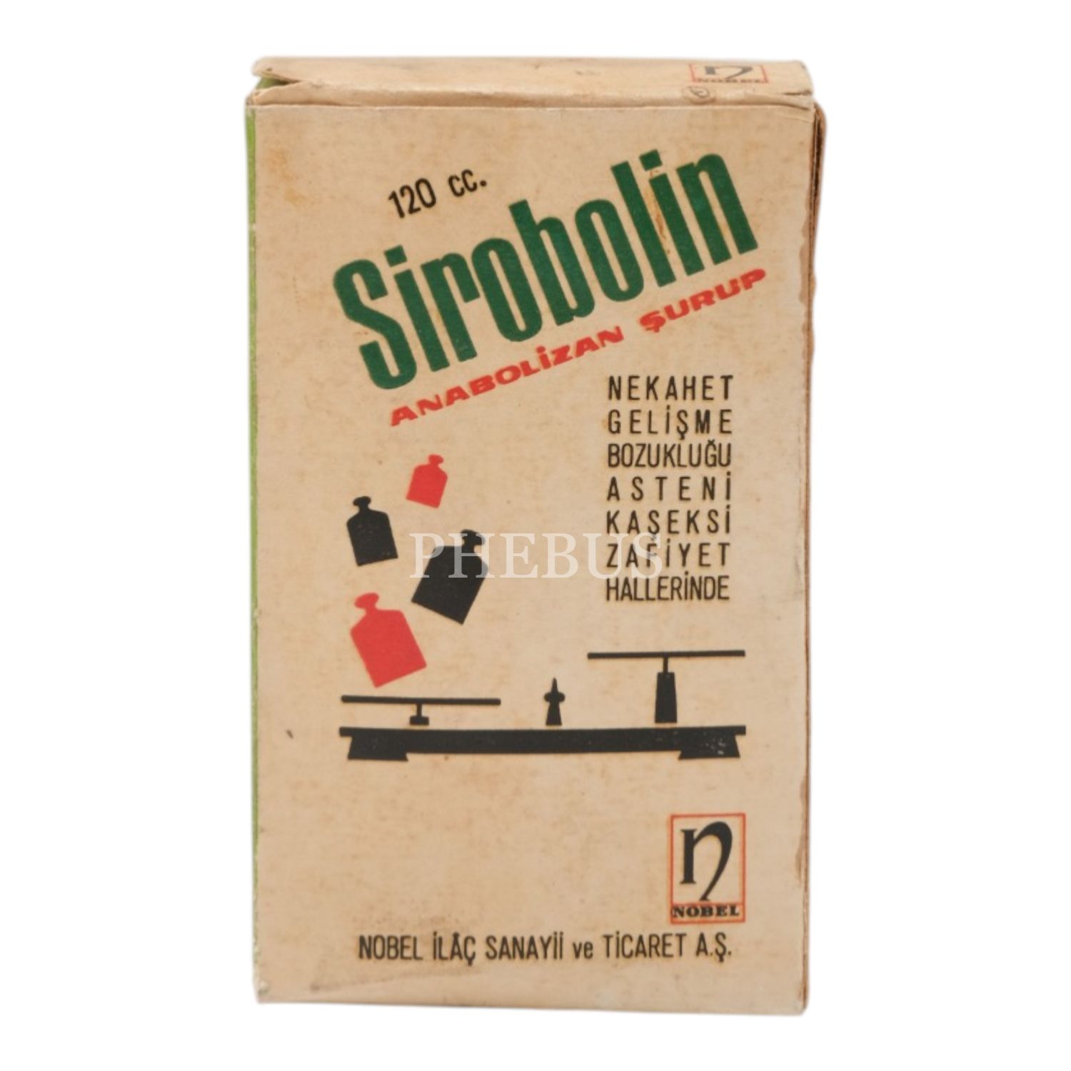 Prospektüsün ve kaşığın yer aldığı orijinal kutusunda, Sirobolin (Anabolizan Şurup) şişesi (yarısından fazlası dolu), Nobel İlâç Sanayii ve Ticaret A.Ş., kutu ölçüsü 6,5x11x3 cm...