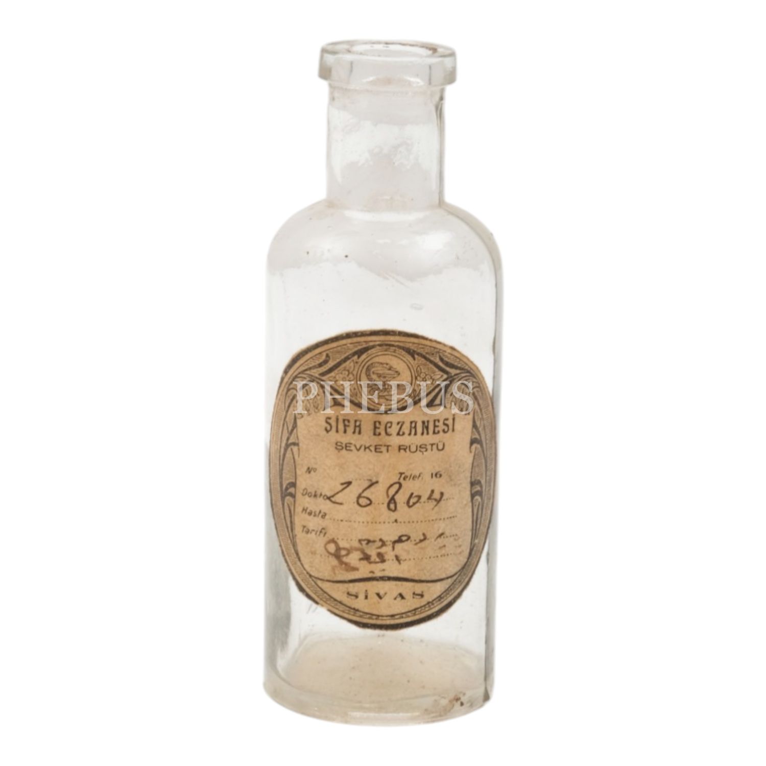 "Şifa Eczanesi / Şevket Rüştü - Sivas" etiketli ilaç şişesi, 9,5x3,5 cm...