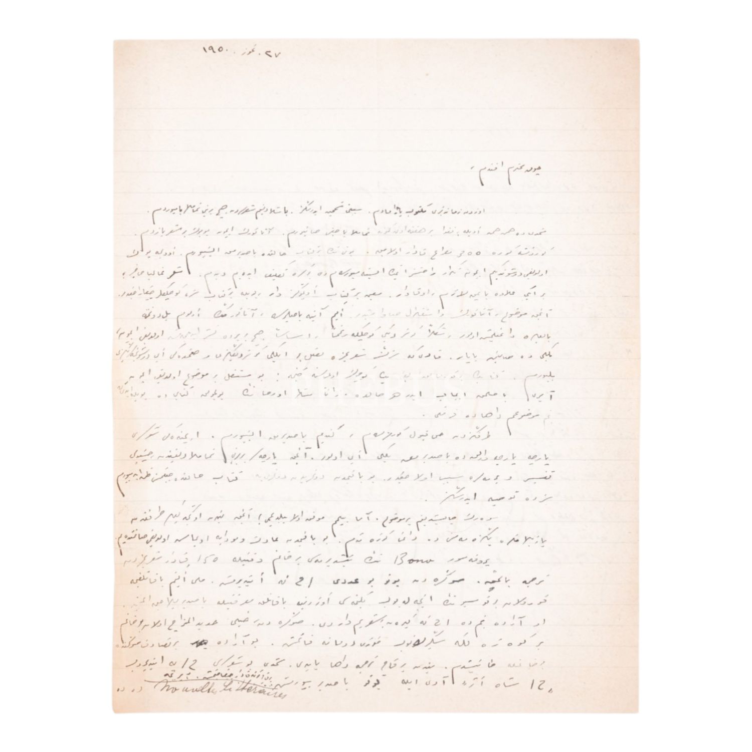 Cahit Külebi´nin Mustafa Kemal Atatürk için yazdığı "Atatürk Kurtuluş Savaşında" adlı uzun şiiri hakkında kaleme aldığı imzalı mektubu, 27 Temmuz 1950, 23x30 cm