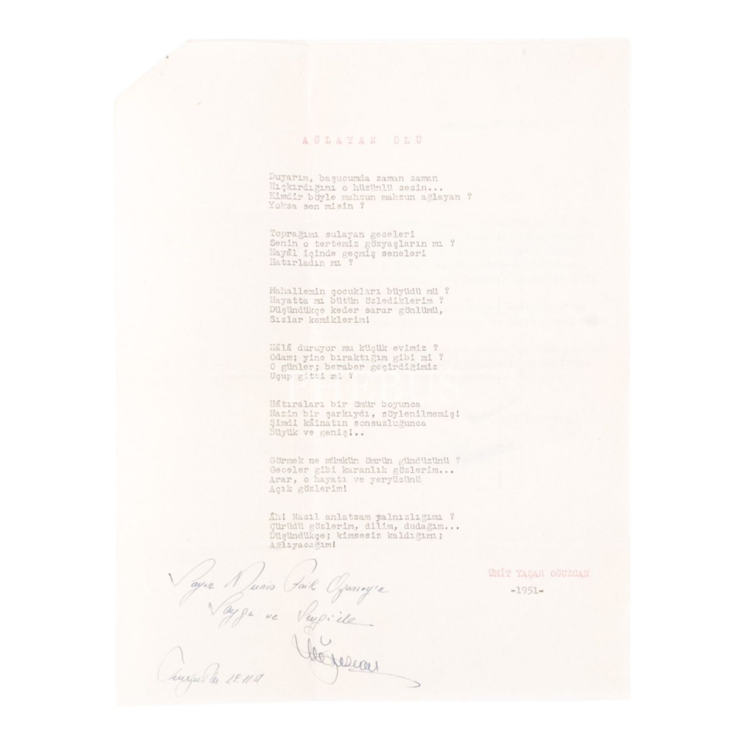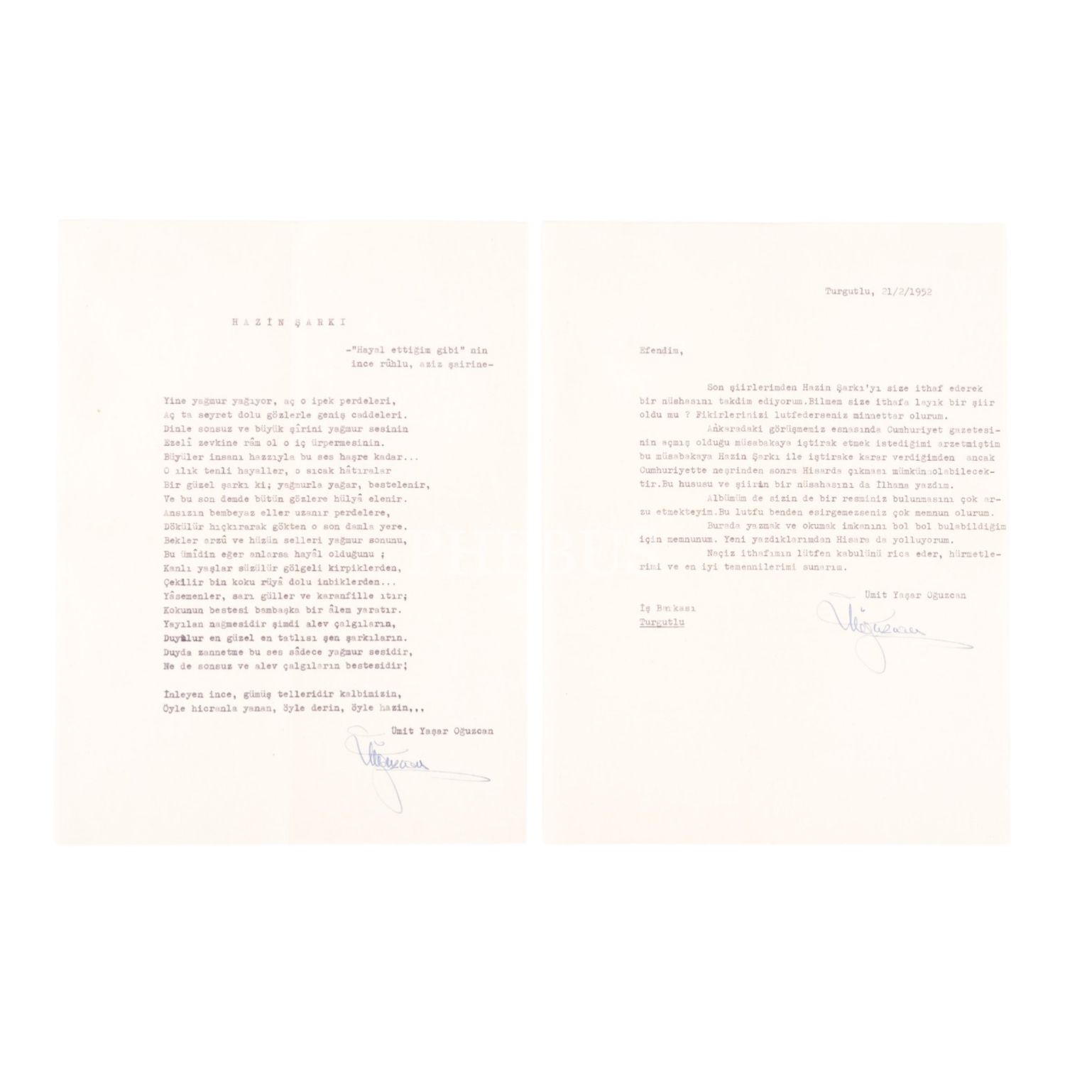 Mektuplardan birinde, Ümit Yaşar Oğuzcan "Hazin Şarkı" adlı şiirini kaleme almıştır, diğerinde "Ağlayan Ölü" adlı şiirini kaleme almıştır. Sonuncusundaysa gönderdiği "Hazin Şarkı" şiiri hakkında Munis Faik Ozansoy´a yazmıştır.