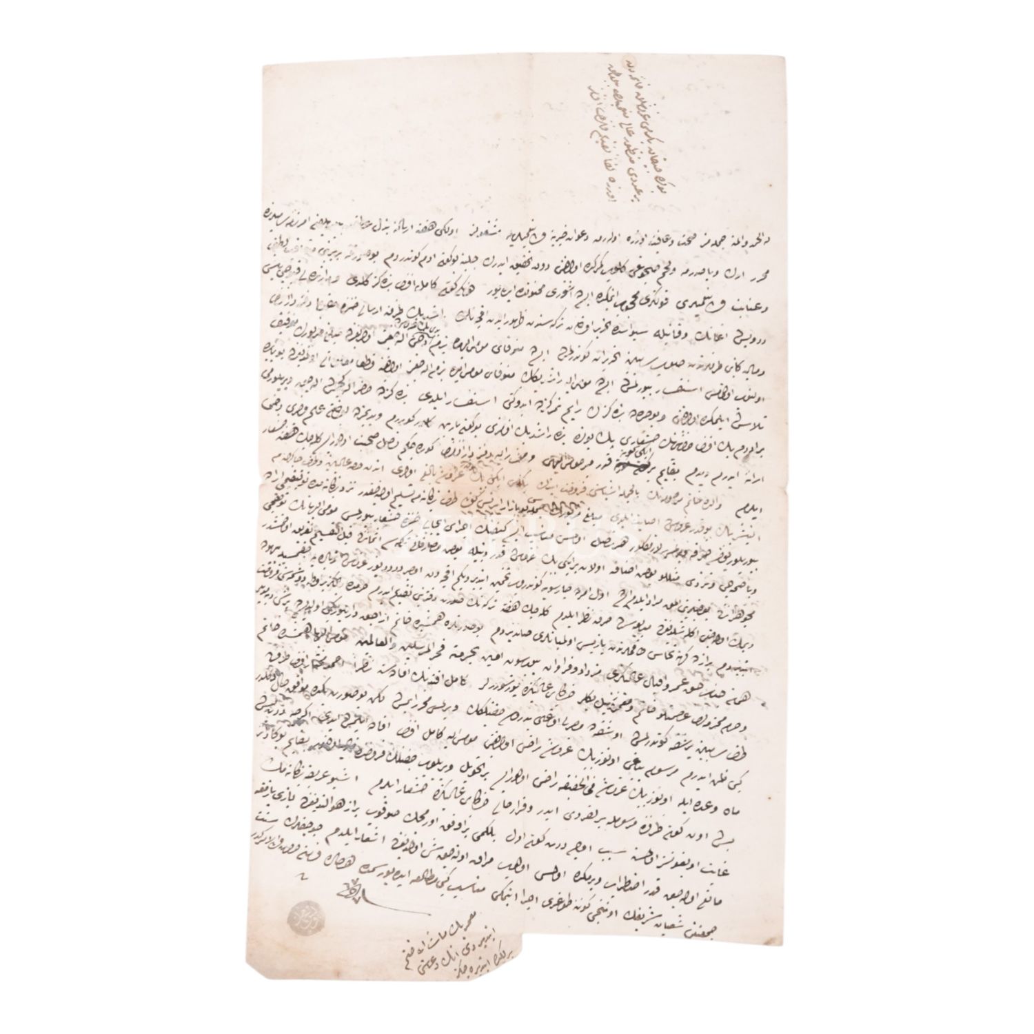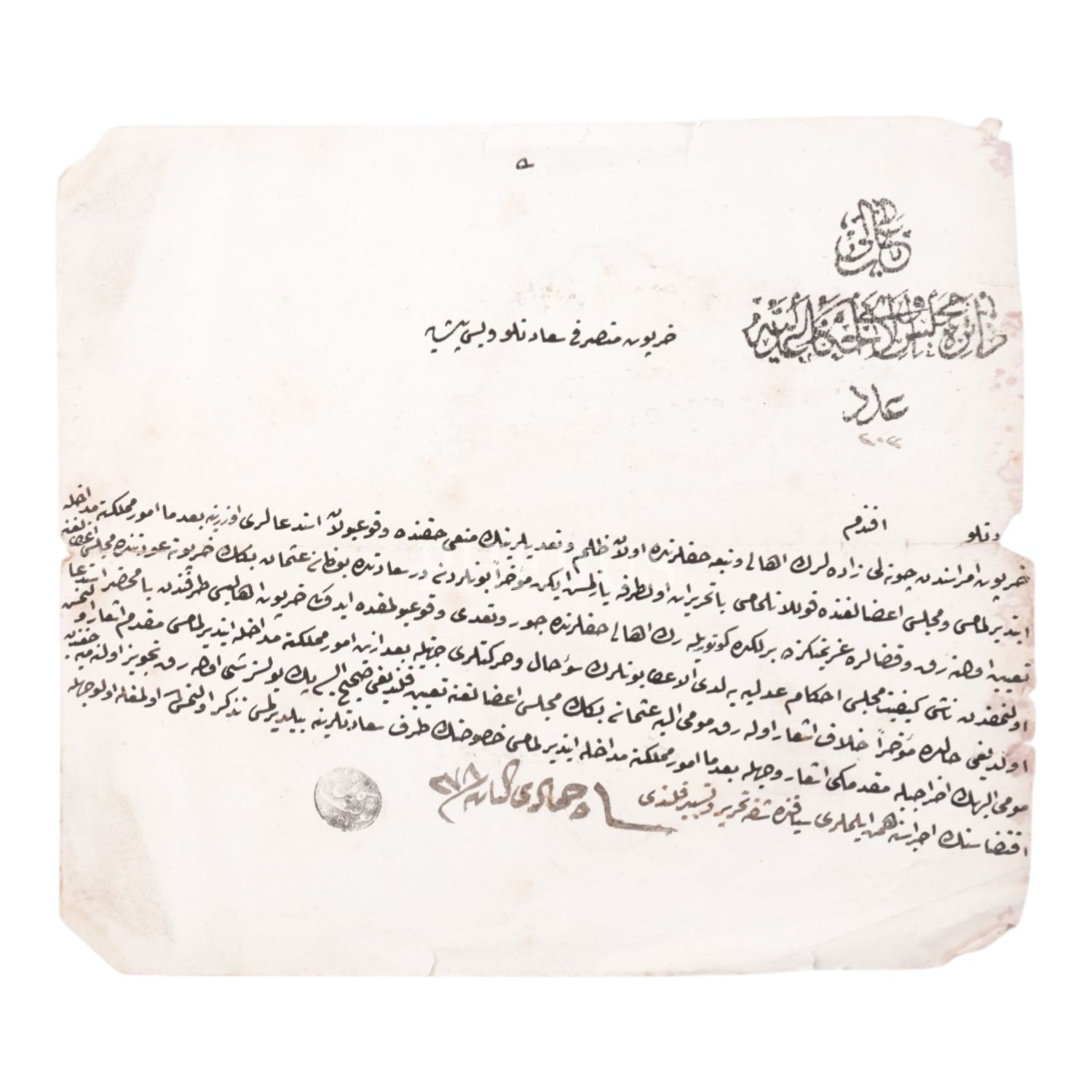 Osmanlı Devleti’nde sadrazamlık görevinde de bulunmuş Yusuf Kamil Paşa’nın, Meclis-i Vâlâ-yı Ahkâm-ı Adliye’de görevli bulunduğu dönemde kaleme aldığı; Harput ahalisine zulmettikleri gerekçesiyle ayan seçilmeleri yasaklanan Çotalızade ailesinden Osman Bey’in Meclis-i Âyan’a seçilmesi üzerine, Harput Mutasarrıfı Veysi Paşa’ya bu kararın değiştirilmesi gerektiğini bildiren evrak, 20x18 cm...