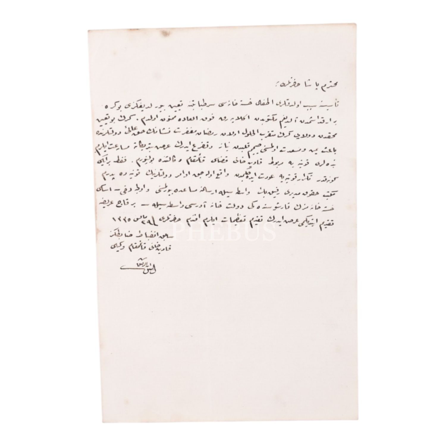 Konya Hukuk Mektebi Dekanı Hüseyin Refik Kırış´ın oğlu Kadınhanı Kaymakamı Emin Bey´in, Şişli Etfal Hastanesi´nin kurucu başhekimi İbrahim Talat Bey´e hitaben kaleme alıp imzaladığı mektubu, 1335, 13x20 cm...