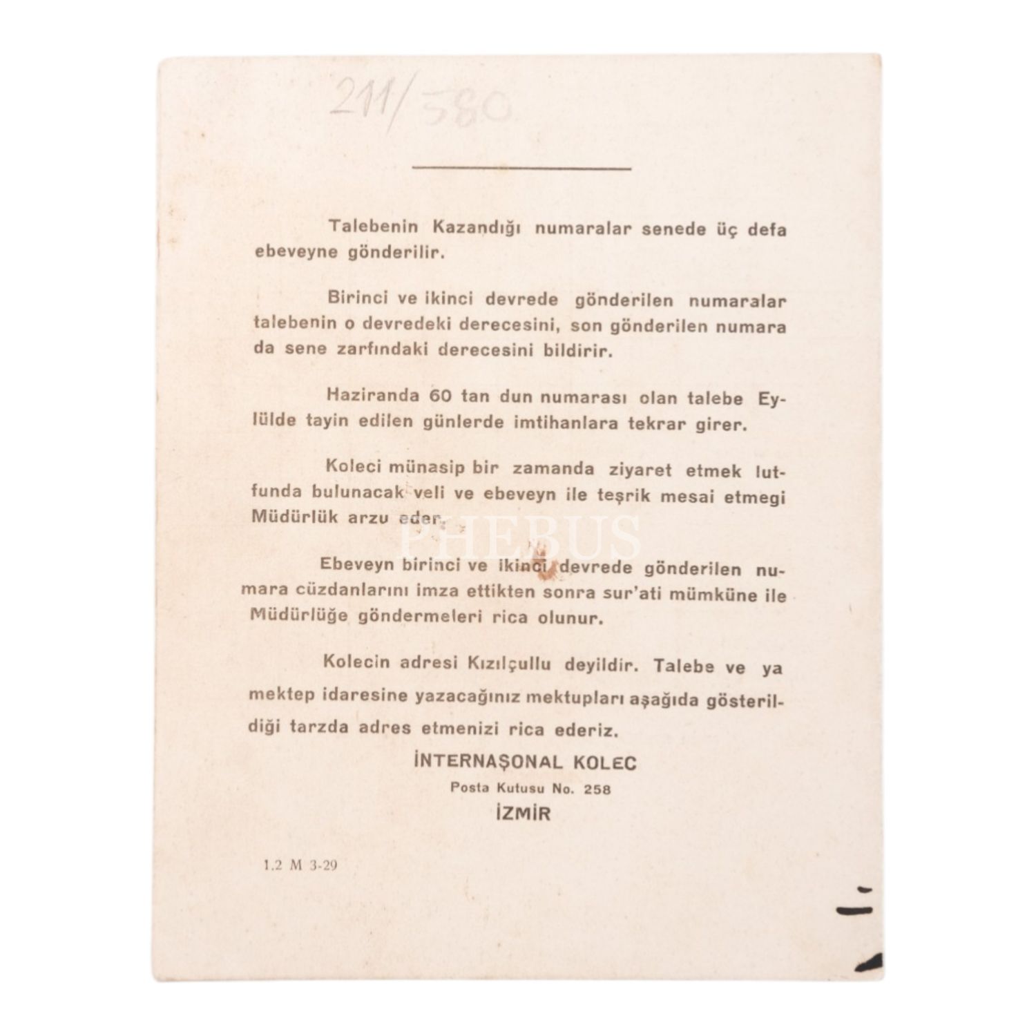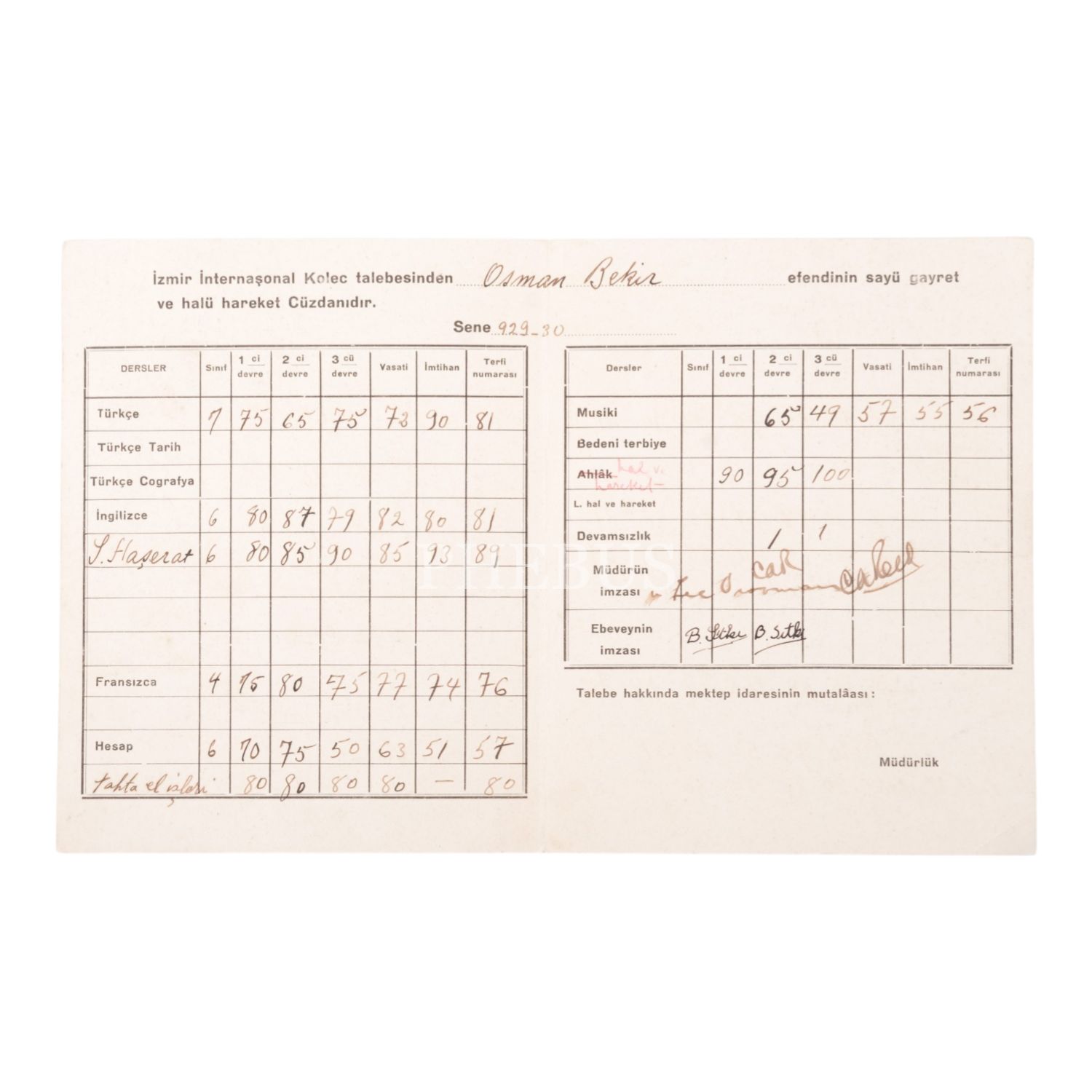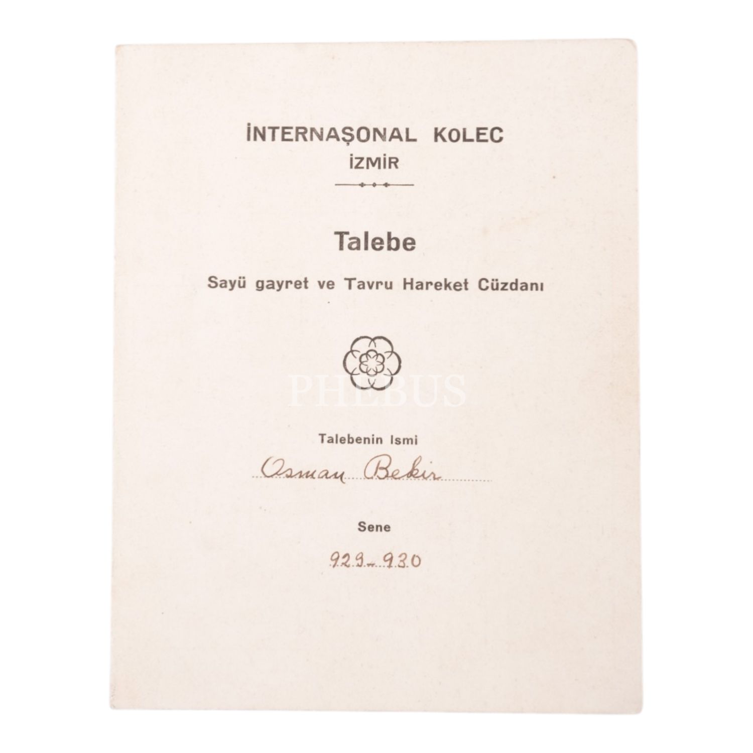 İzmir İnternaşonal Kolec´nin 1929-1930 eğitim dönemindeki öğrencilerinden Osman Bekir Bey´in karnesi, 24x15 cm...