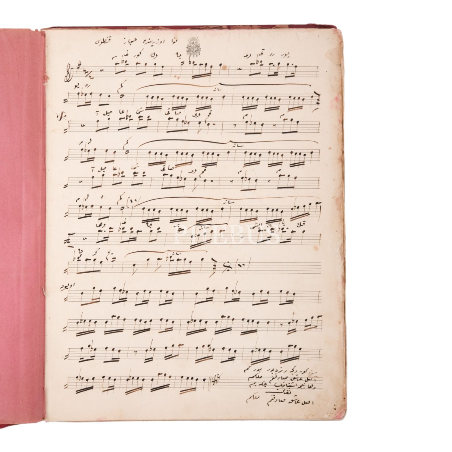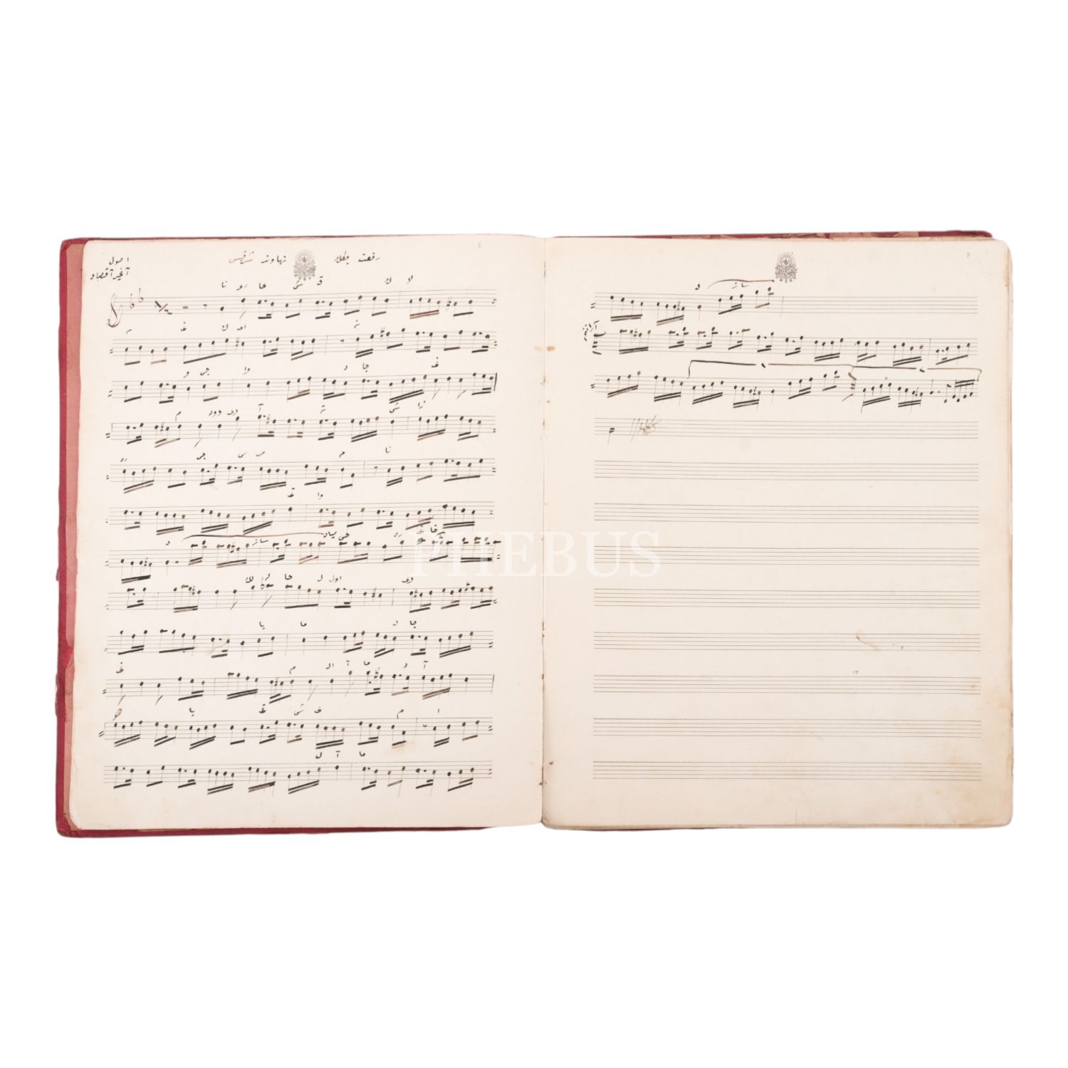 Her bir sayfasında ve ön kapağında Osmanlı Devlet armasının yer aldığı, Osmanlıca beste ve güfteler yazılı nota defteri, 27x34 cm...