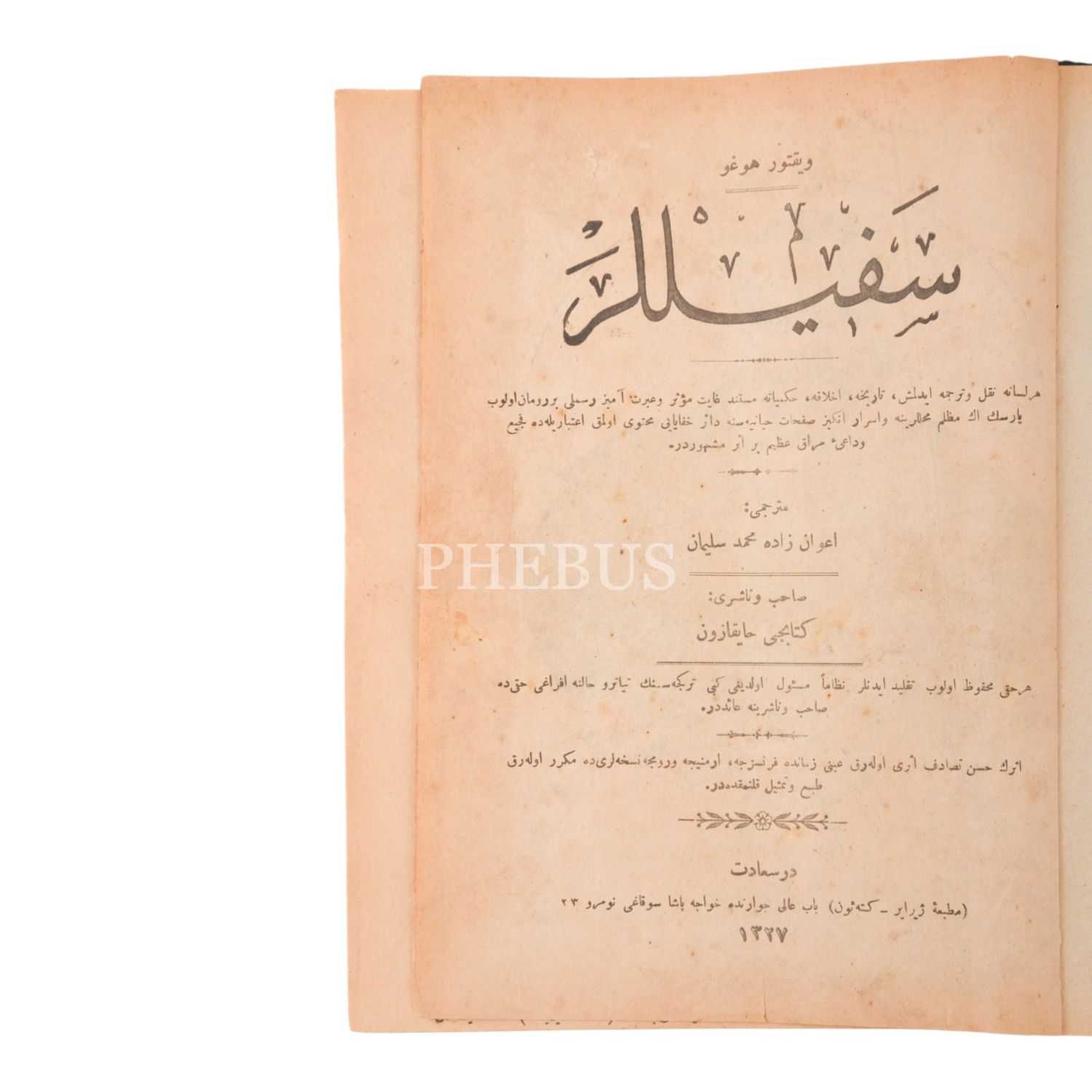 SEFİLLER, Victor Hugo, (çeviren: Avanzade Mehmet Süleyman), 1327, Matbaa-i Jirayir Keteon, 1528 sayfa, 17x23 cm...