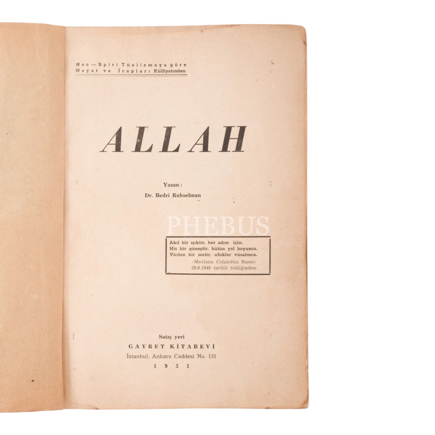 ALLAH, Bedri Ruhselman, 1951, Gayret Kitabevi, 123 sayfa, 17x25 cm...