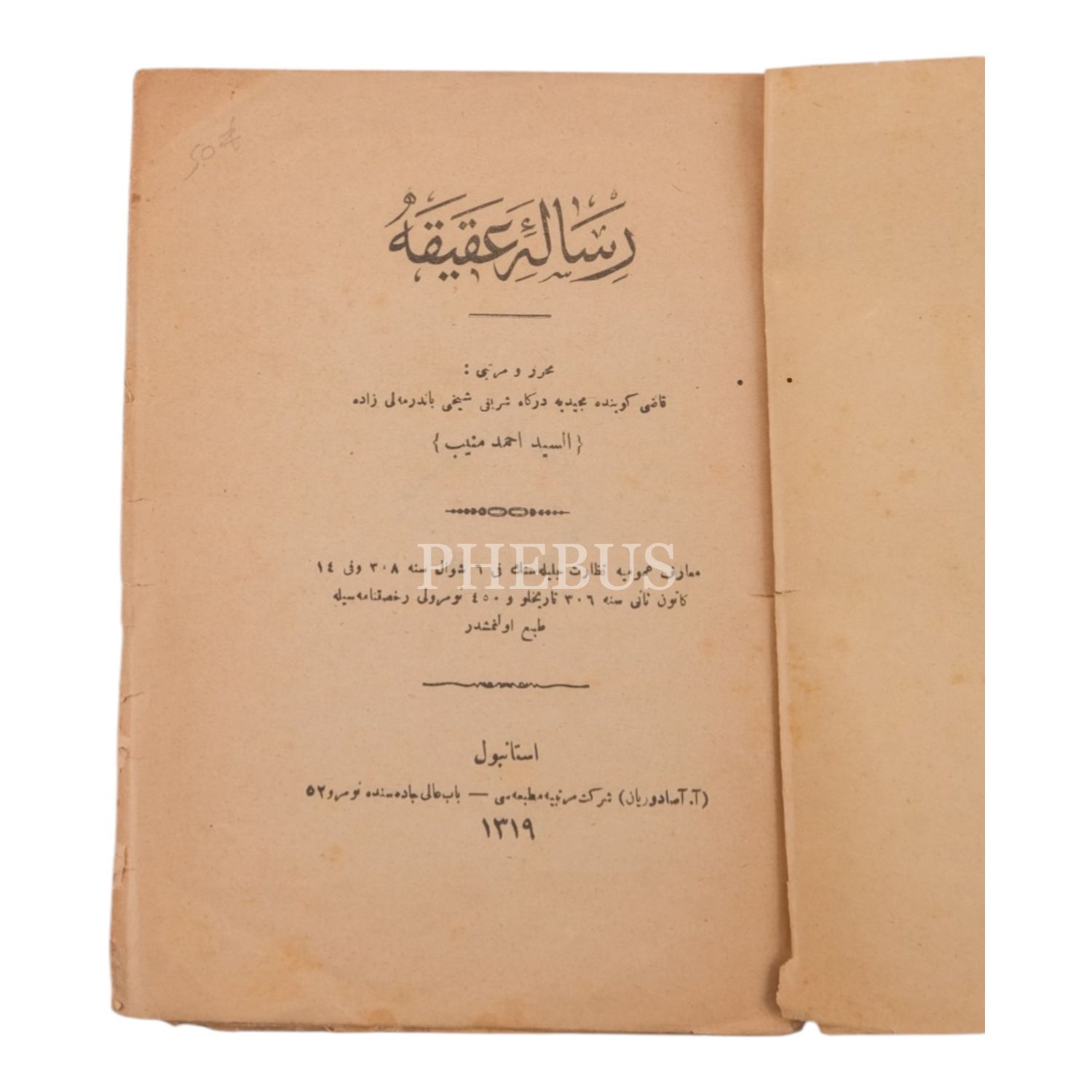 RİSÂLE-İ AKÎKA, Bandırmalızâde Seyyid Ahmed Münib, 1319, Artin Asaduryan Şirket-i Mürettibiye Matbaası, 15 sayfa, 15x21 cm...
