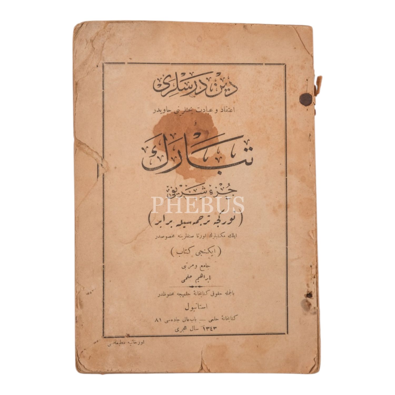 TEBÂREKE CÜZ-İ ŞERÎFİ (TÜRKÇE TERCÜMESİYLE BERABER), derleyen: İbrahim Hilmi, 1343. 39+78 sayfa, 15x22 cm...