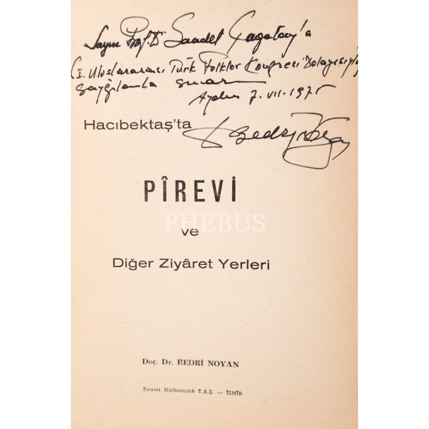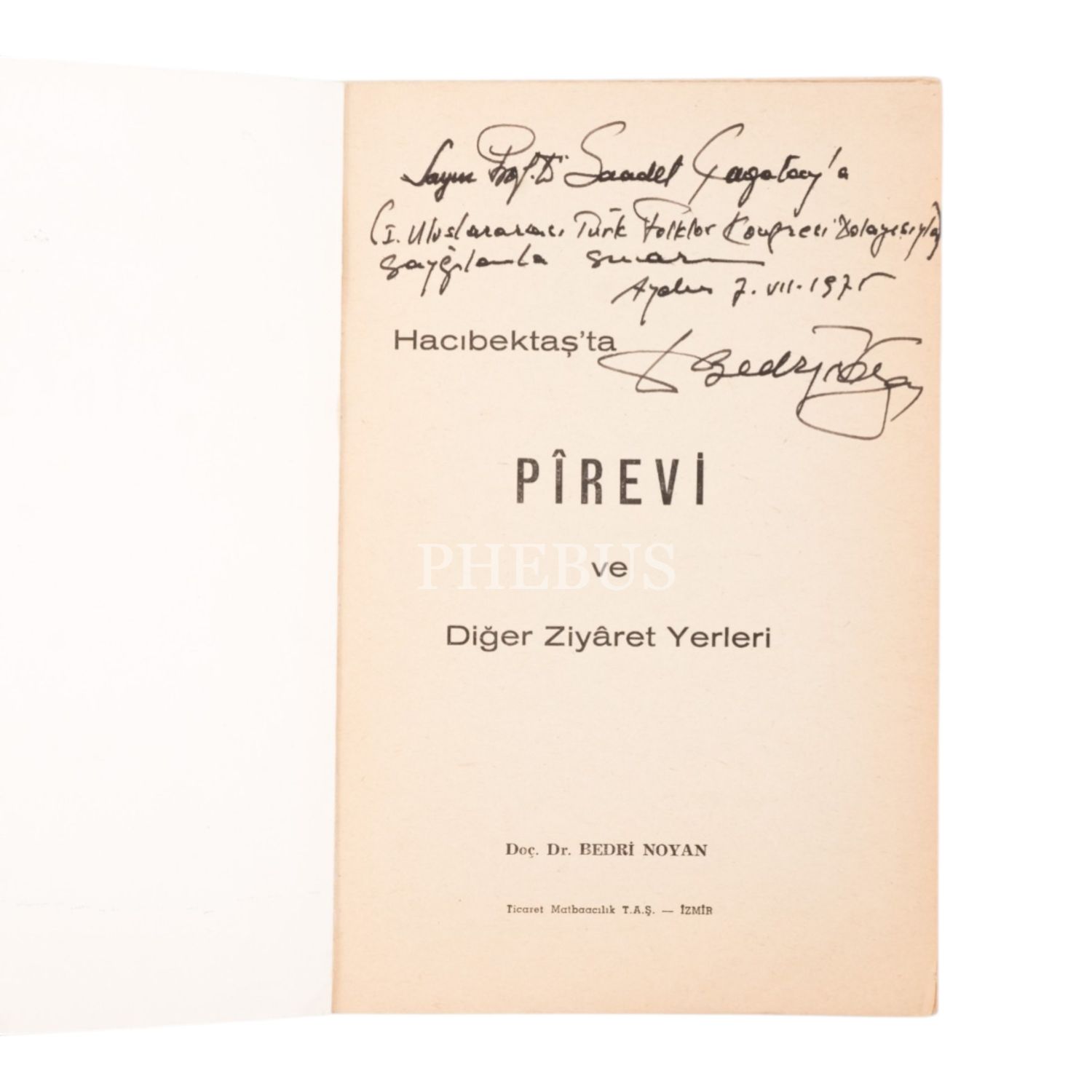 "Sayın Prof. Dr. Saadet Çağatay´a (I. Uluslararası Türk Folklor Kongresi Dolayısıyla) saygılarla sunarım." ithafıyla, 7 Temmuz 1975 tarihinde imzalanmıştır. Kitabın formaları açılmamıştır.