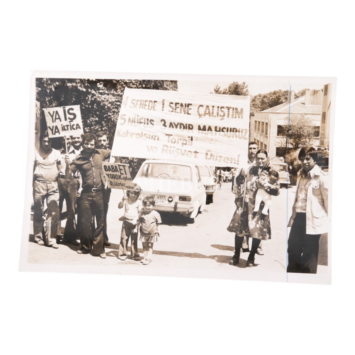 Fotoğrafta görülen pankartlar: "Ya İş Ya İltica.", "-Baba Et Yoook. +Oğlum O Liderlere Mahsus.", "4 Senede 1 Sene Çalıştım. 5 Nüfus 3 Aydır Mahsuruz. Kahrolsun Torpil ve Rüşvet Düzeni."