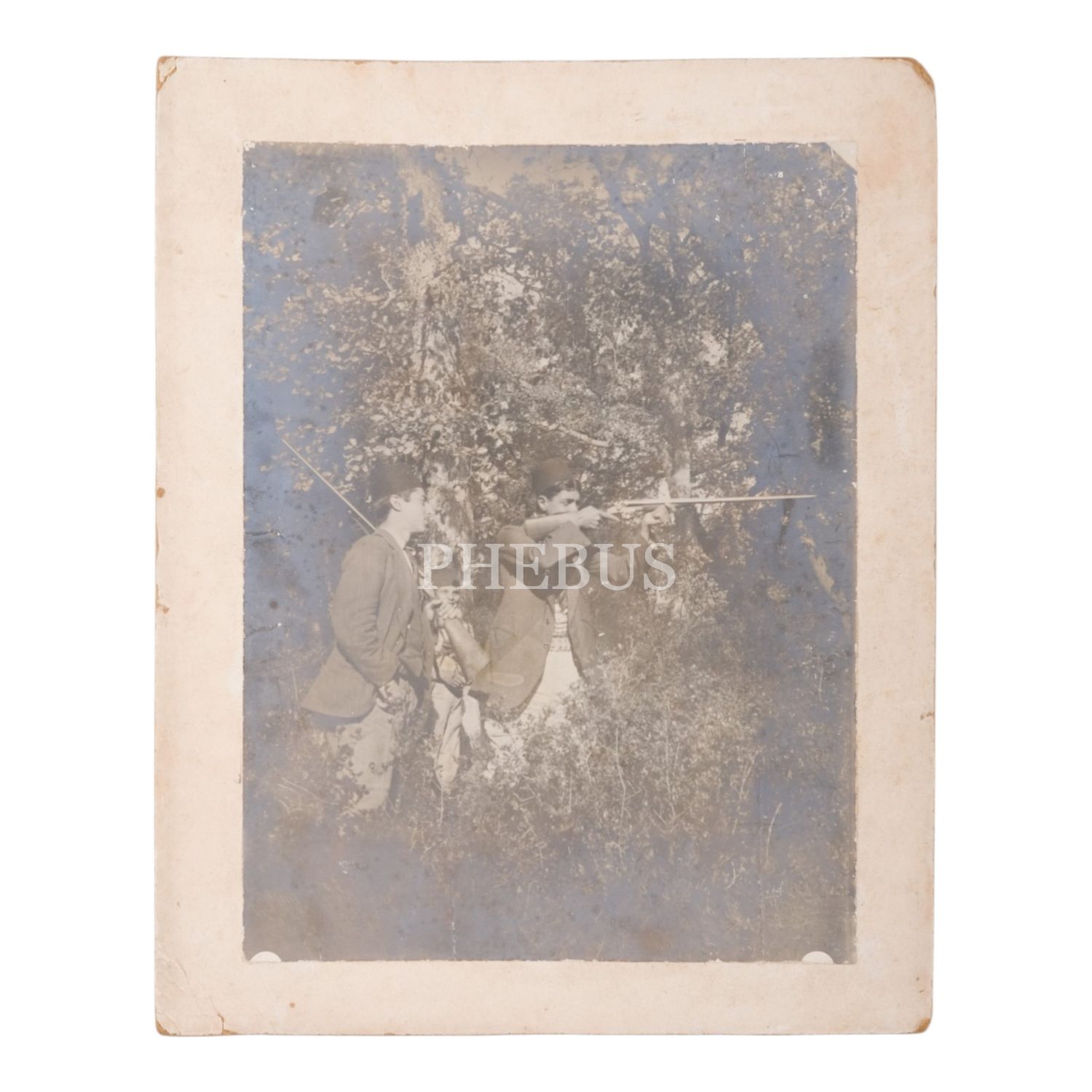 Ellerinde tüfekleriyle ava çıkmış iki fesli delikanlının hatıra fotoğrafı, kartona yapışık, fotoğraf 18x24 cm, karton 23x28 cm...