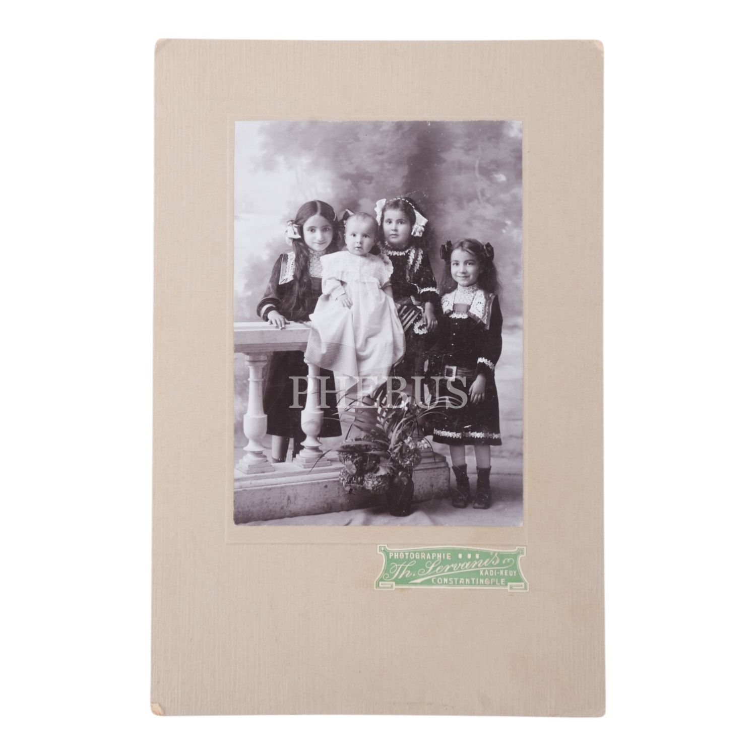 Bir bebeğin, muhtemelen ablalarıyla birlikte, Th. Servanis Fotoğrafhanesi´nde (Kadı-Keuy [Kadıköy], Constantinople) çekilmiş kabin fotoğrafı, 15,5x23 cm...