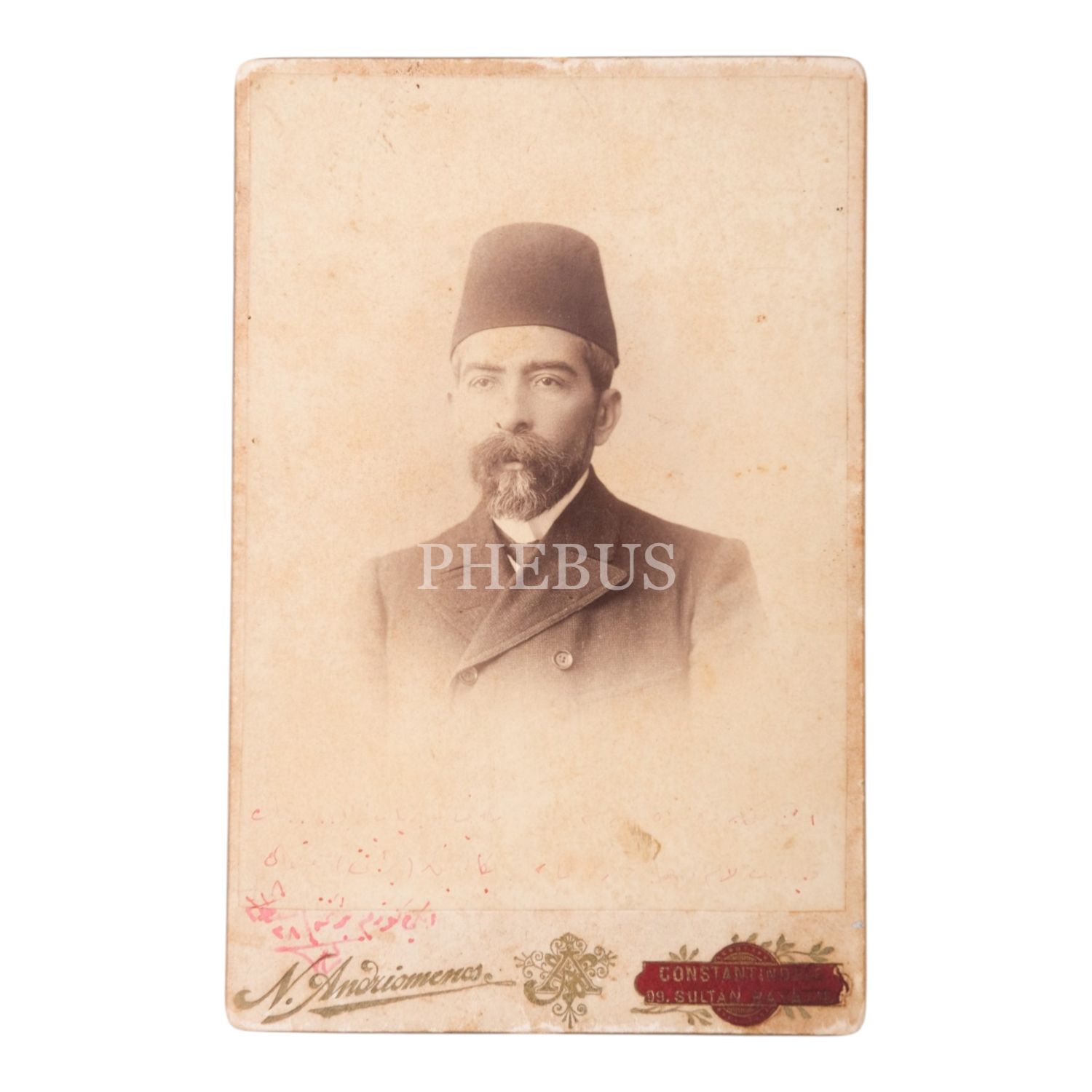 Menemenlizade Rıfat Bey'in, Nikola Andriomenos Fotoğrafhanesi´nde çektirdiği ithaflı ve imzalı hatıra fotoğrafı, 11x17 cm...