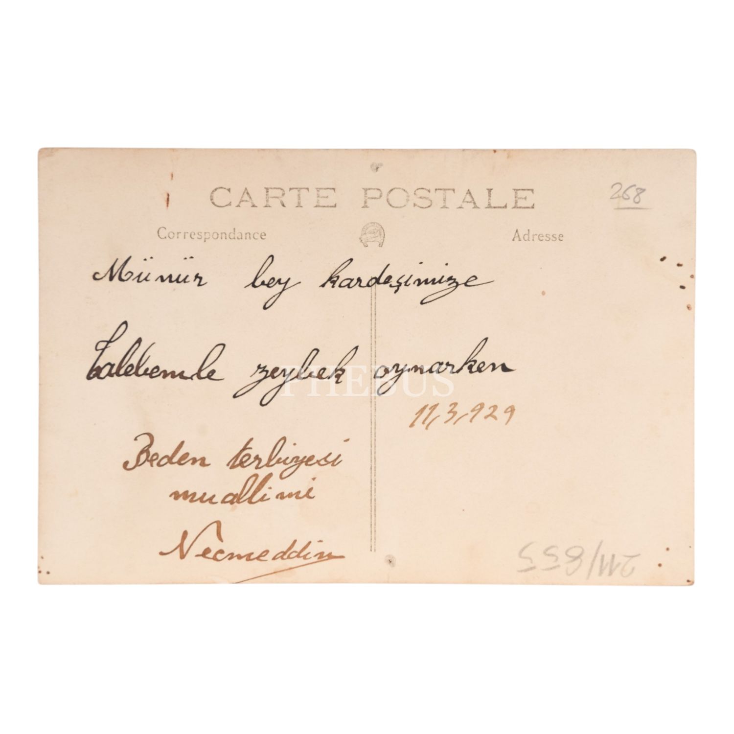 "Münür bey kardeşimize balelerle zeybek oynarken. Beden terbiyesi muallimi Necmeddin." ithafıyla, 11 Mart 1929 tarihinde imzalanmıştır.