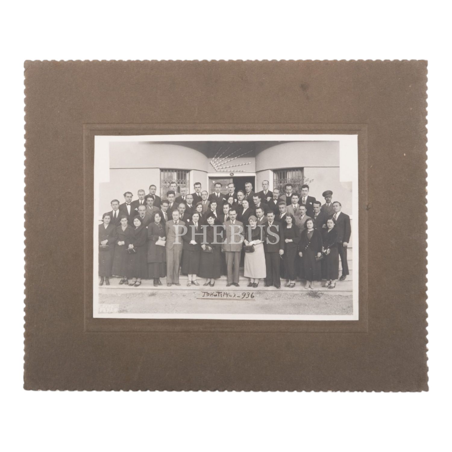 Tokat´ta, girişinde Altı Ok sembolünün yer aldığı bir bina önünde (muhtemelen Halkevi) çekilmiş toplu hatıra fotoğrafı, 14 Mart 1936, Foto Peker, fotoğraf 17x12 cm, paspartu 27x22 cm...