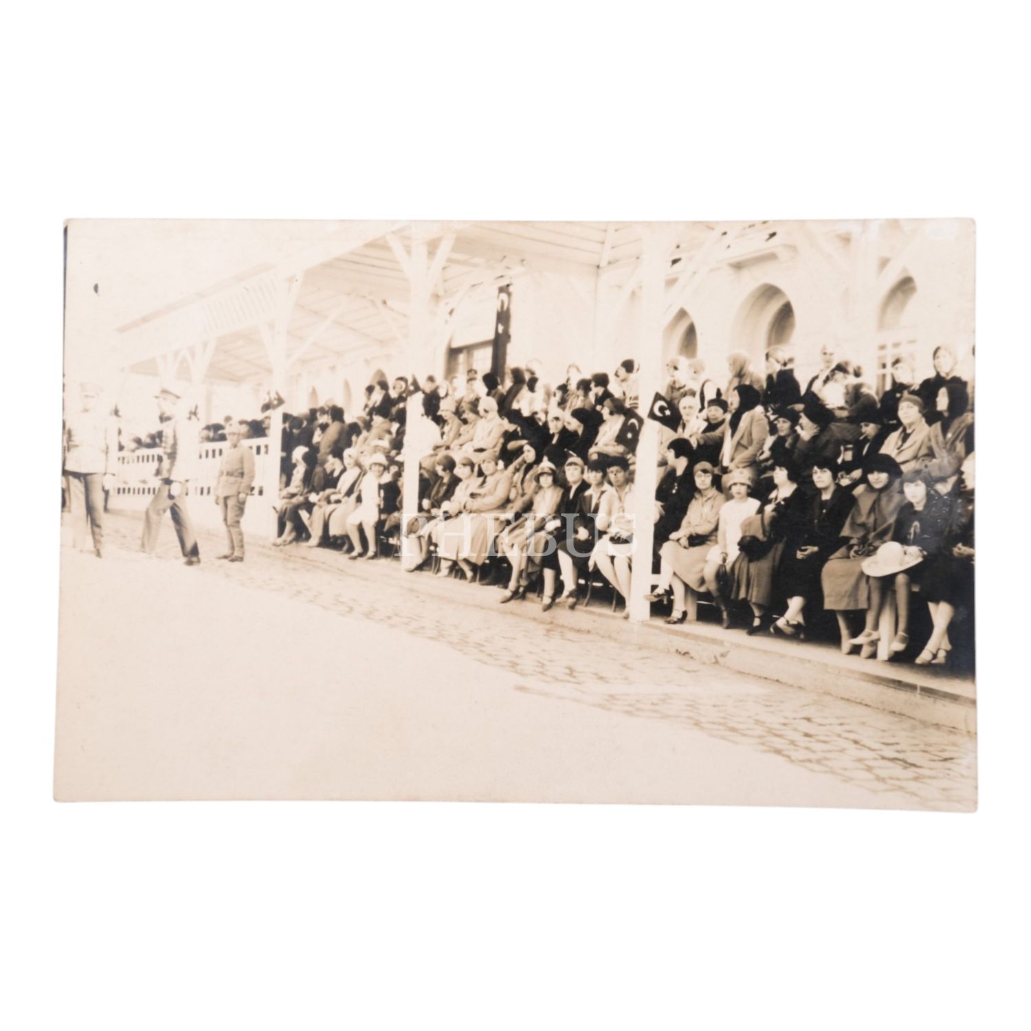 Erken Cumhuriyet döneminden, muhtemelen bir millî bayram töreninde çekilmiş, kadınlardan oluşan bir izleyici grubunun ve görevli askerlerin görüldüğü bir fotoğraf, 14x9 cm...