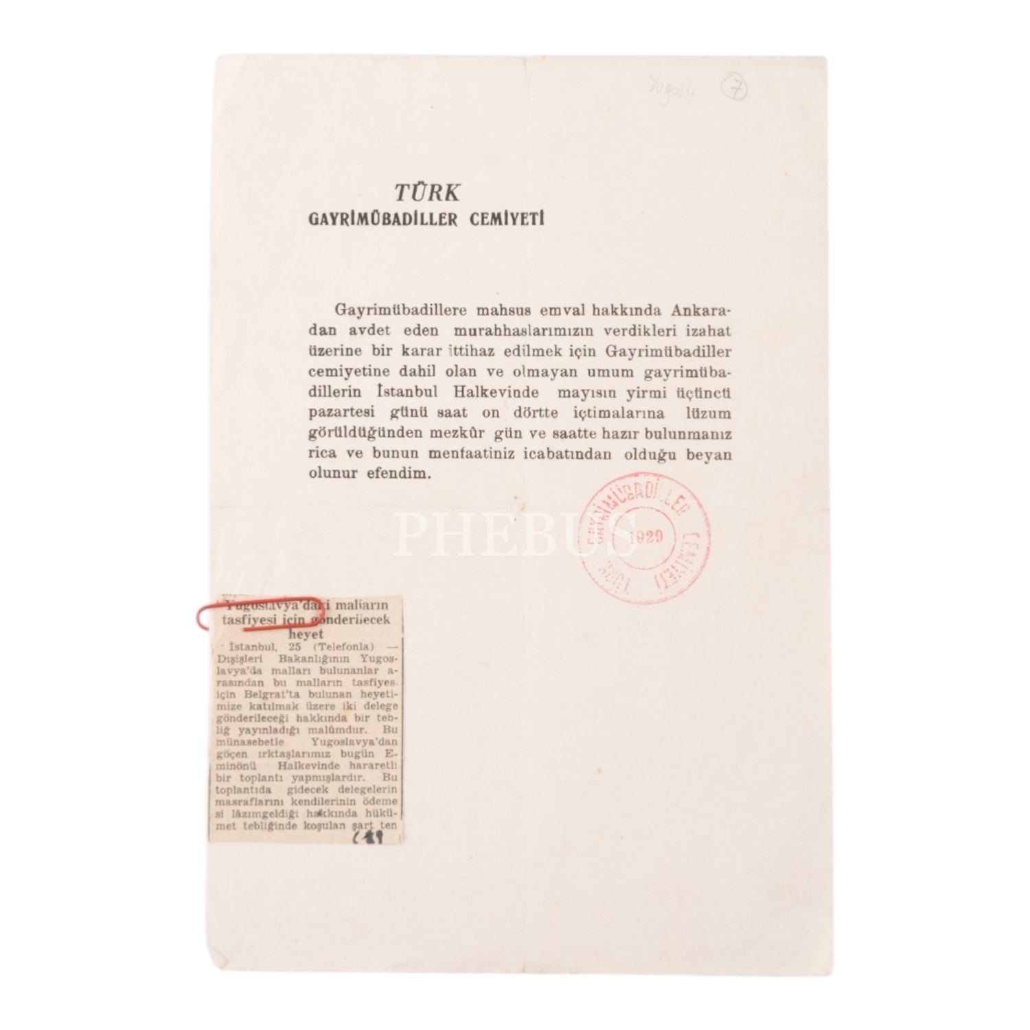 Türk Gayrimübadiller Cemiyeti´nin İstanbul Halkevi´nde düzenleyecekleri toplantı için hazırlanmış davetiye, 16x24 cm...