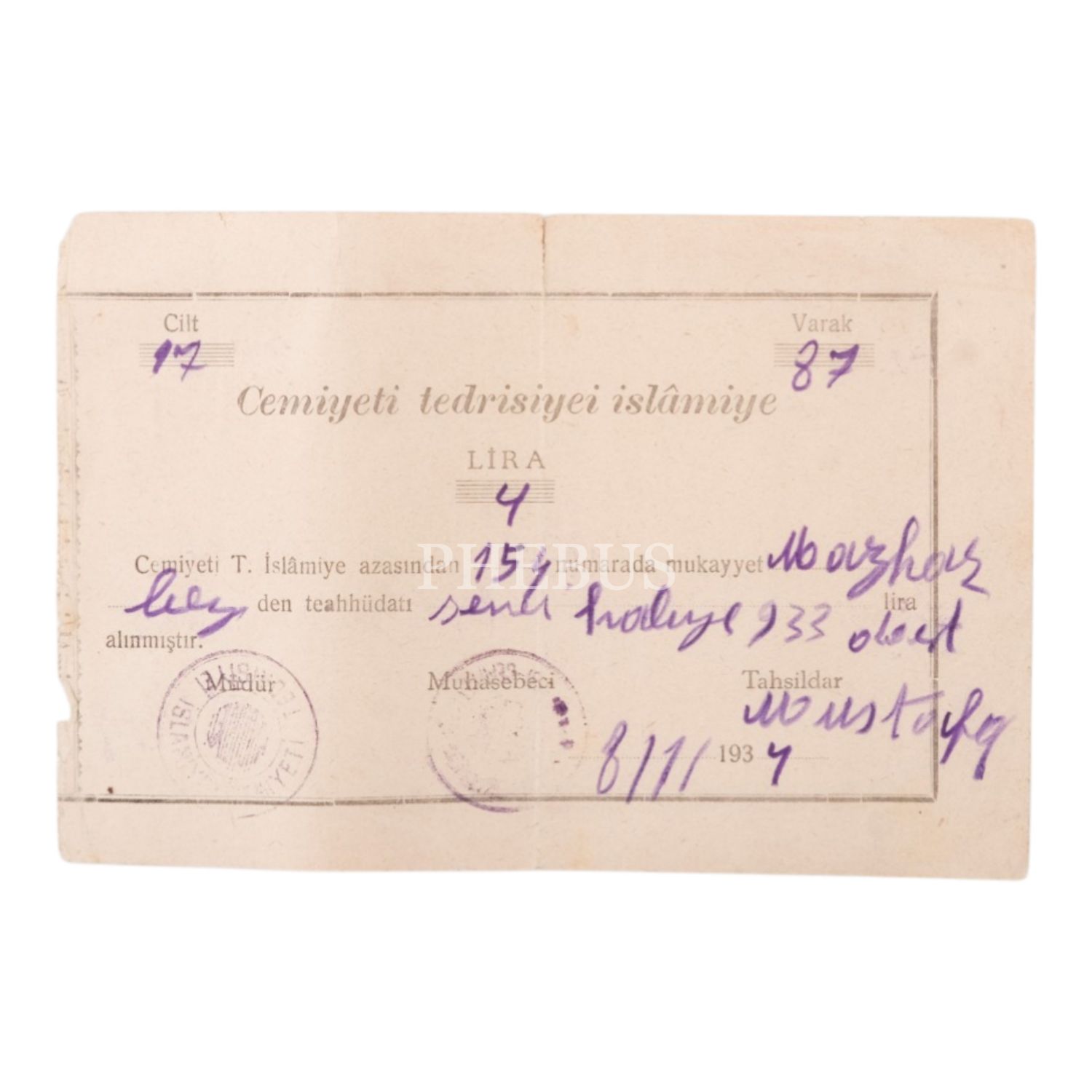 Cemiyeti Tedrisiyei İslâmiye (sonradan “Türk Okutma Kurumu”) bağış makbuzu, 18x12 cm...