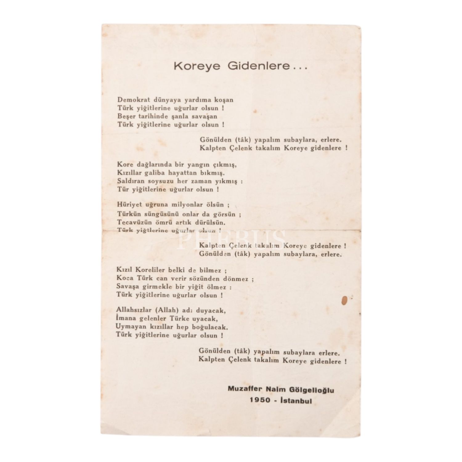 1951 yılında şair Muzaffer Naim Gölgelioğlu tarafından kaleme alınan, "Koreye Gidenlere..." başlıklı şiir, 14x22,5 cm...
