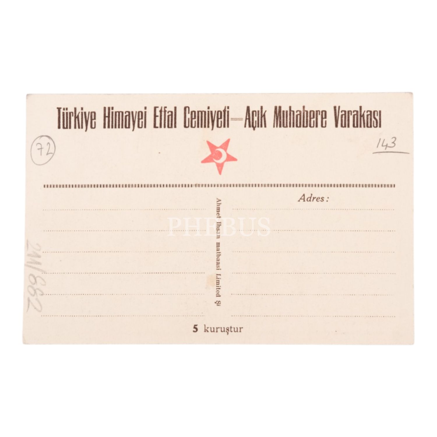 Türkiye Himayei Etfal Cemiyeti Açık Muhabere Varakası, Ahmet İhsan Matbaası, 9x14 cm...