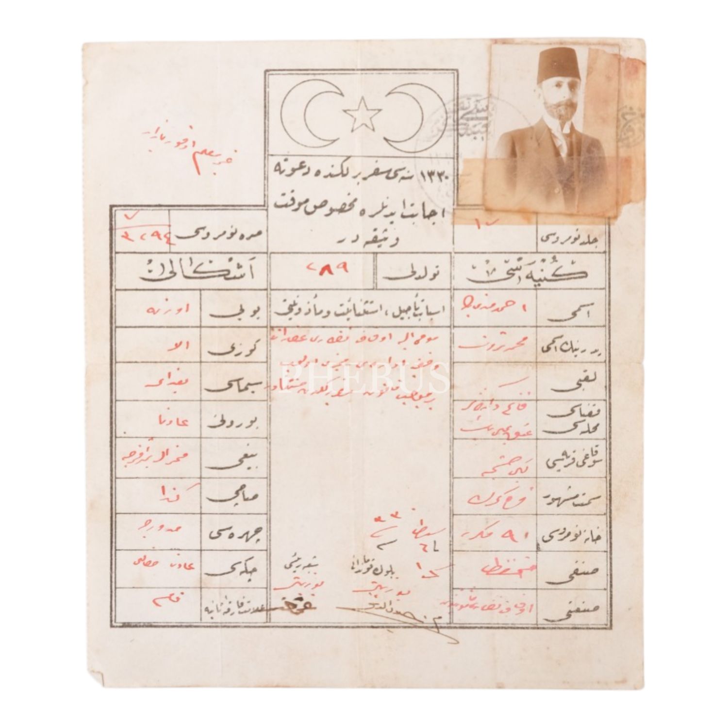 Evkaf Nezareti´nde Vakfiye İdaresi Memuru olan Ahmed Nuri Bey adına düzenlenmiş, 1330 senesi seferberlik davetine icabet edenlere verilen evrak, 13x25 cm...