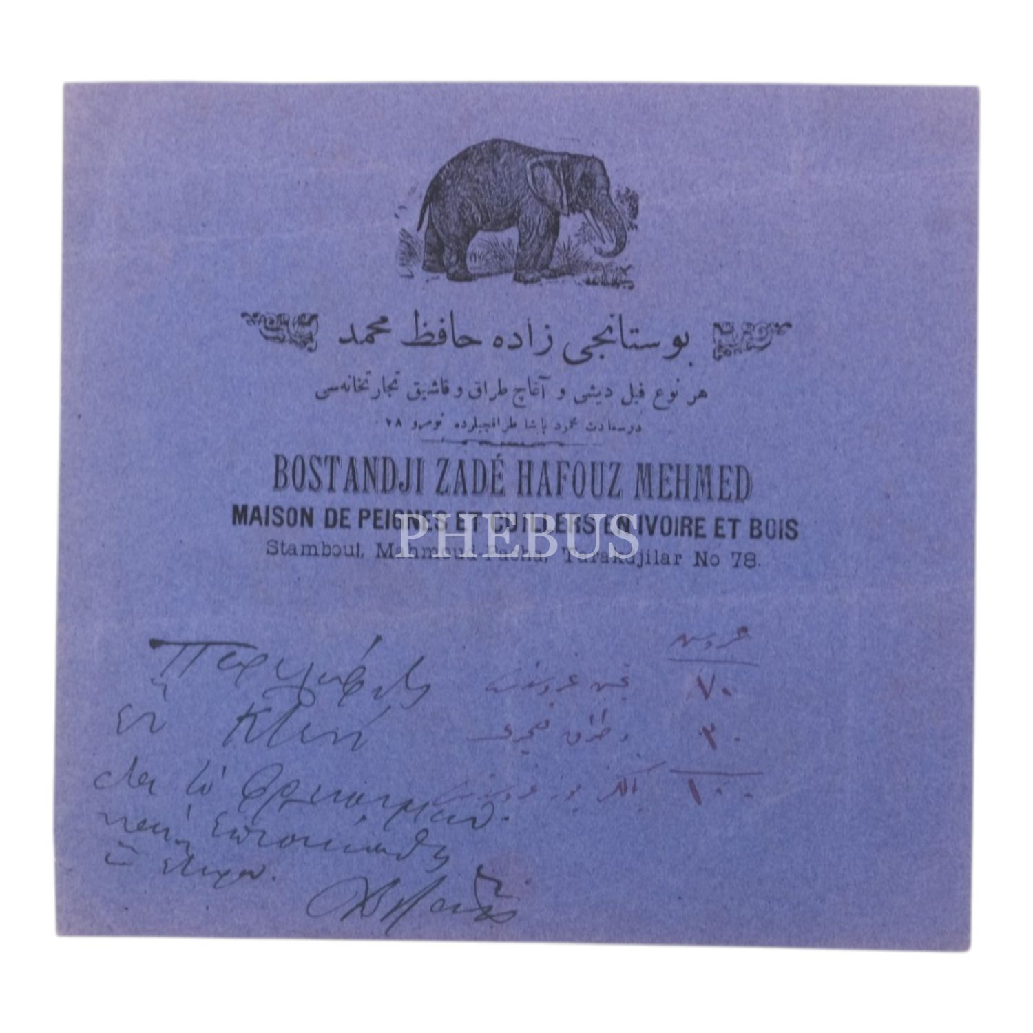 "Bostancızade Hafız Mehmed - Her nevi fildişi ve ağaç tarak ve kaşık ticarethanesi - Mahmutpaşa Tarakçılar" reklamlı etiket, 21x19 cm...