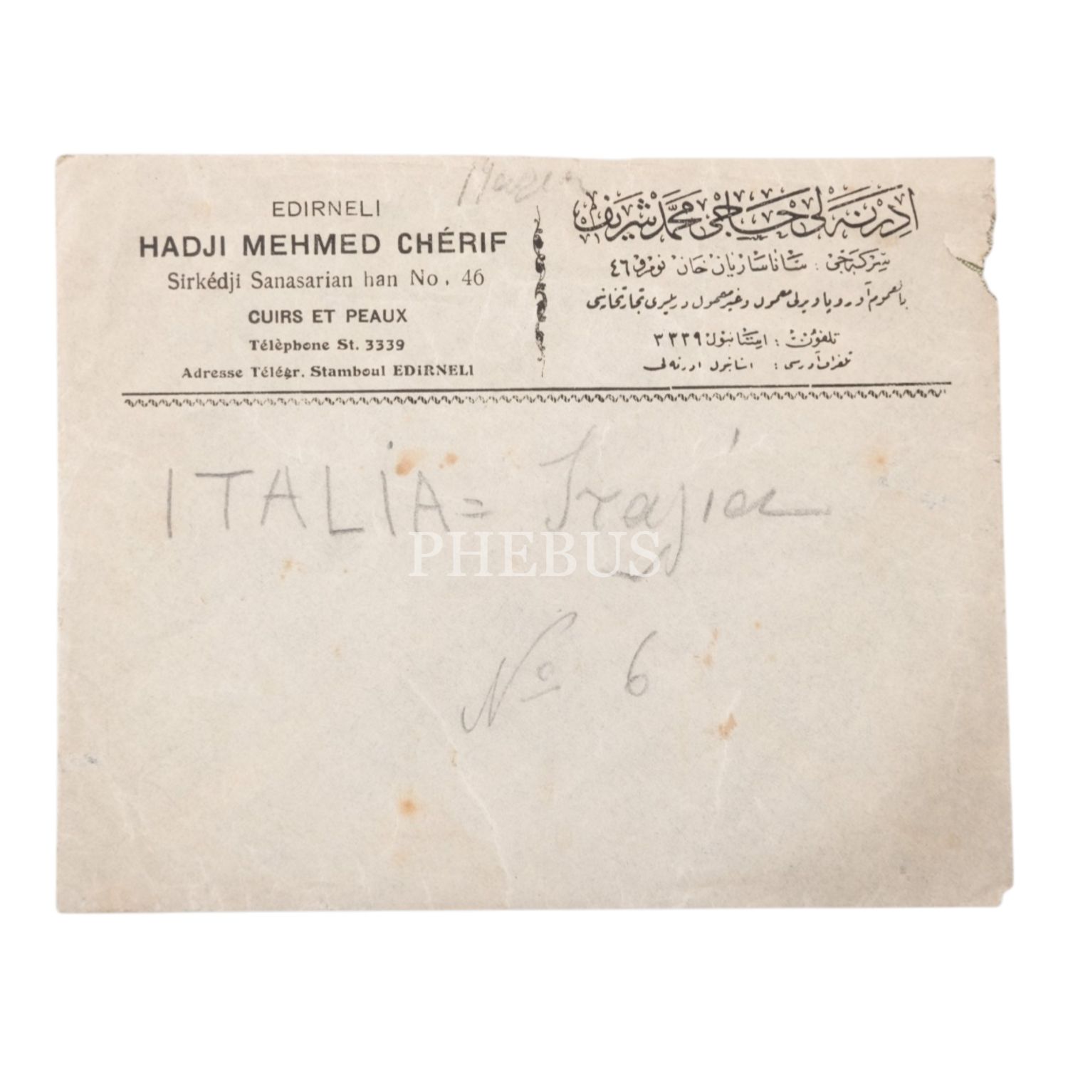 Osmanlıca ve Fransızca "Edirneli Hacı Mehmed Şerif - Bilumum Avrupa ve yerli mamul ve gayrı mamul deriler ticarethanesi - Sirkeci Sanasaryan Han", antetli mektup zarfı, 16x12 cm...