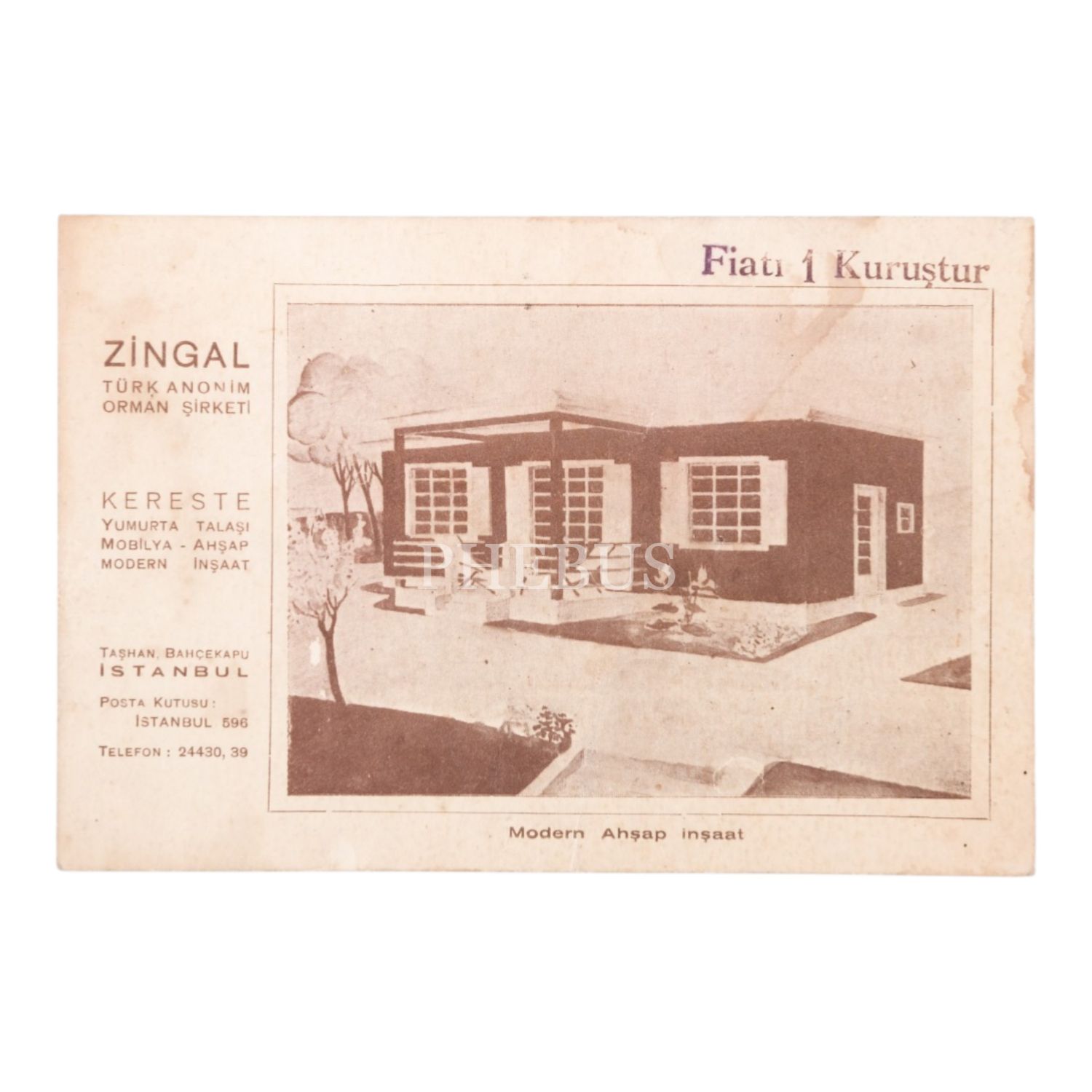 "Zingal Türk Anonim Orman Şirketi (Kereste - Yumurta Talaşı - Mobilya - Ahşap Modern İnşaat) - Taşhan, Bahçekapu, İstanbul" yazılı işyeri kartı, 15x10 cm...