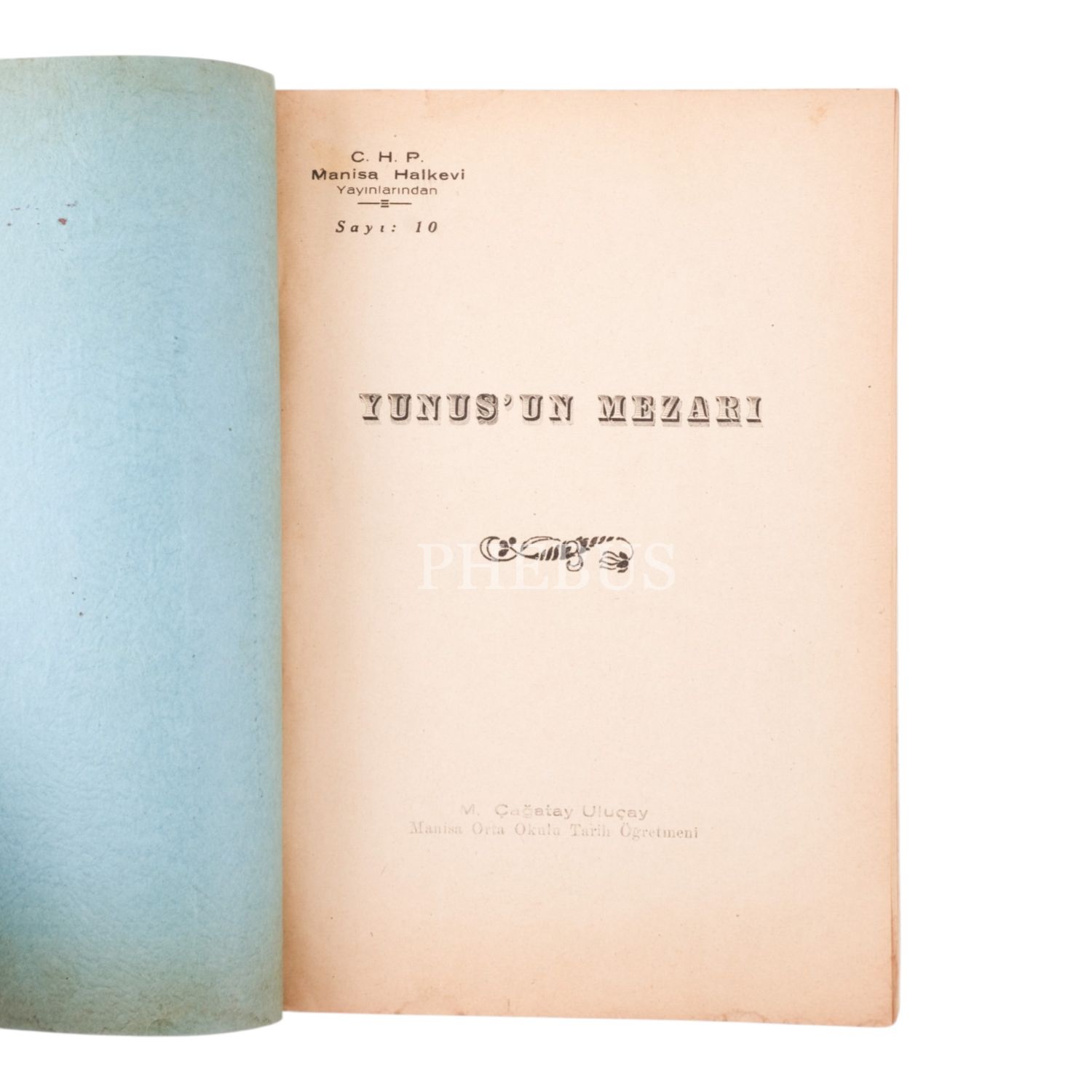 YUNUS´UN MEZARI, M. Çağatay Uluçay, 1943, C.H.P. Manisa Halkevi Yayınlarından Sayı: 10, Gediz Basımevi (Manisa),19+2 sayfa, 17x24 cm...